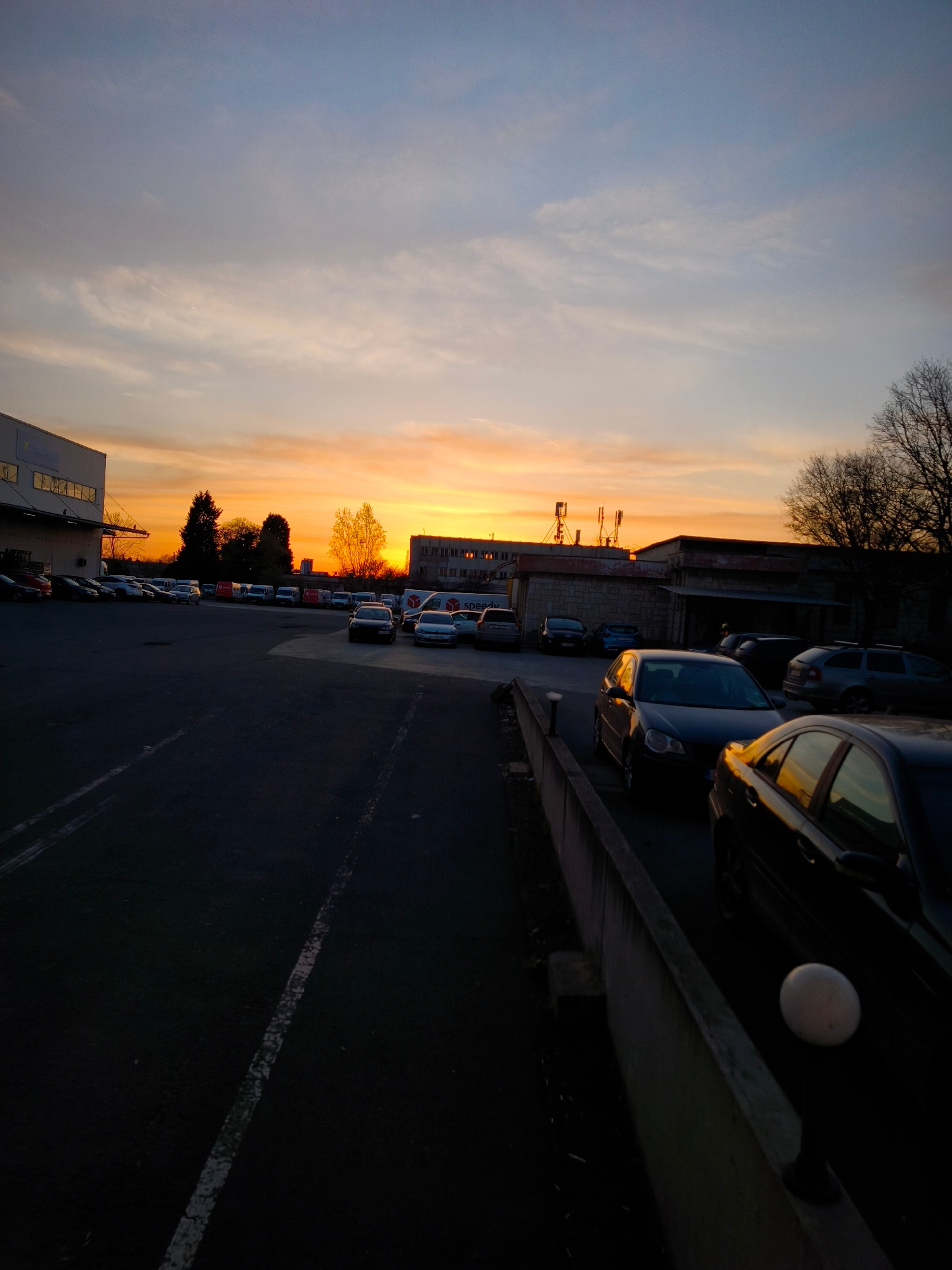 The image depicts a parking lot scene in Burgas, Bulgaria, during sunset. In the foreground, several parked cars are visible along a concrete barrier. A row of cars extends into the middle ground. In…read more
