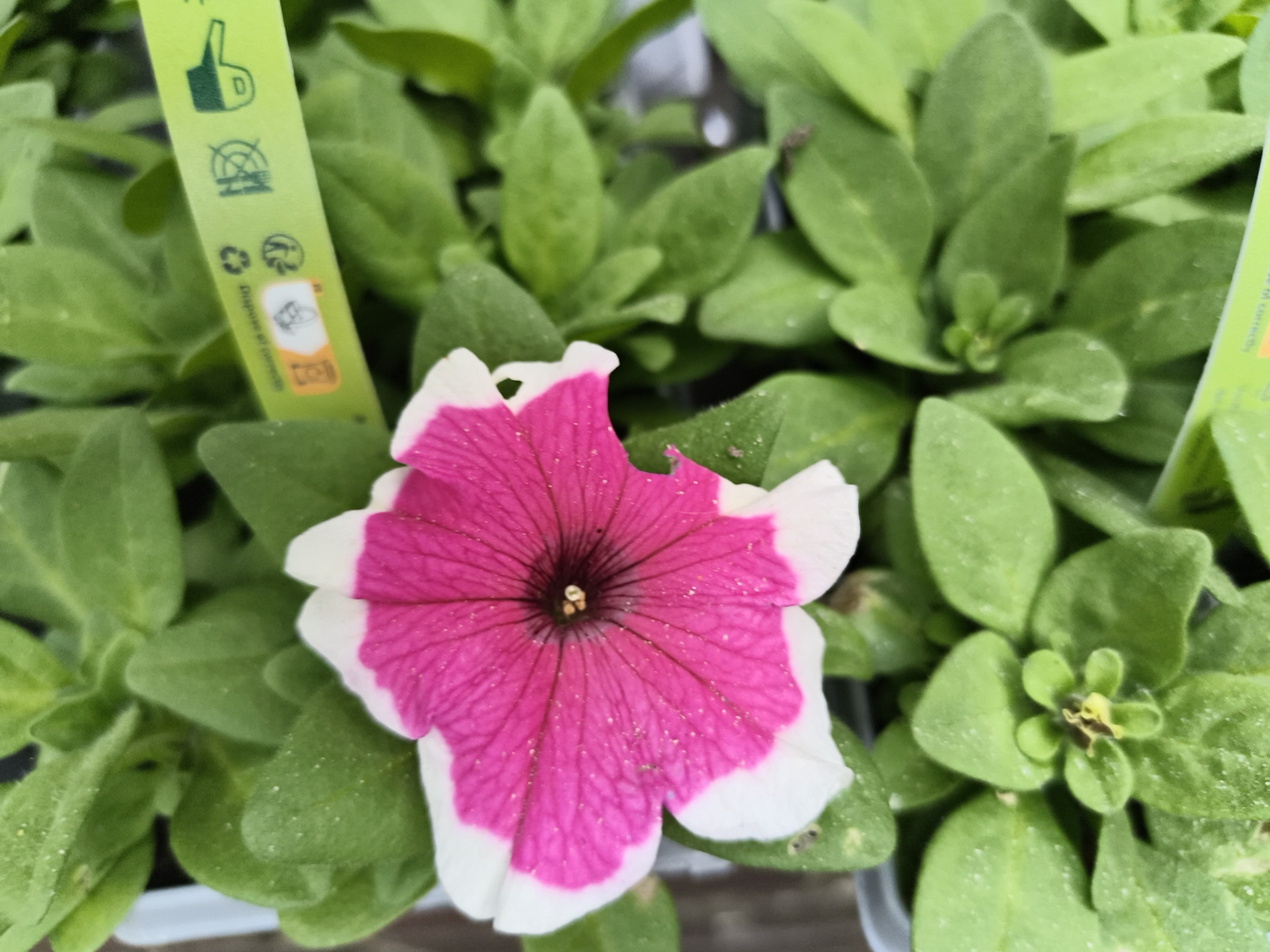 A close-up photograph captures a vibrant petunia flower with striking pink petals edged in white, positioned centrally within a bed of green foliage. The flower displays a deep purplish-black center w…read more
