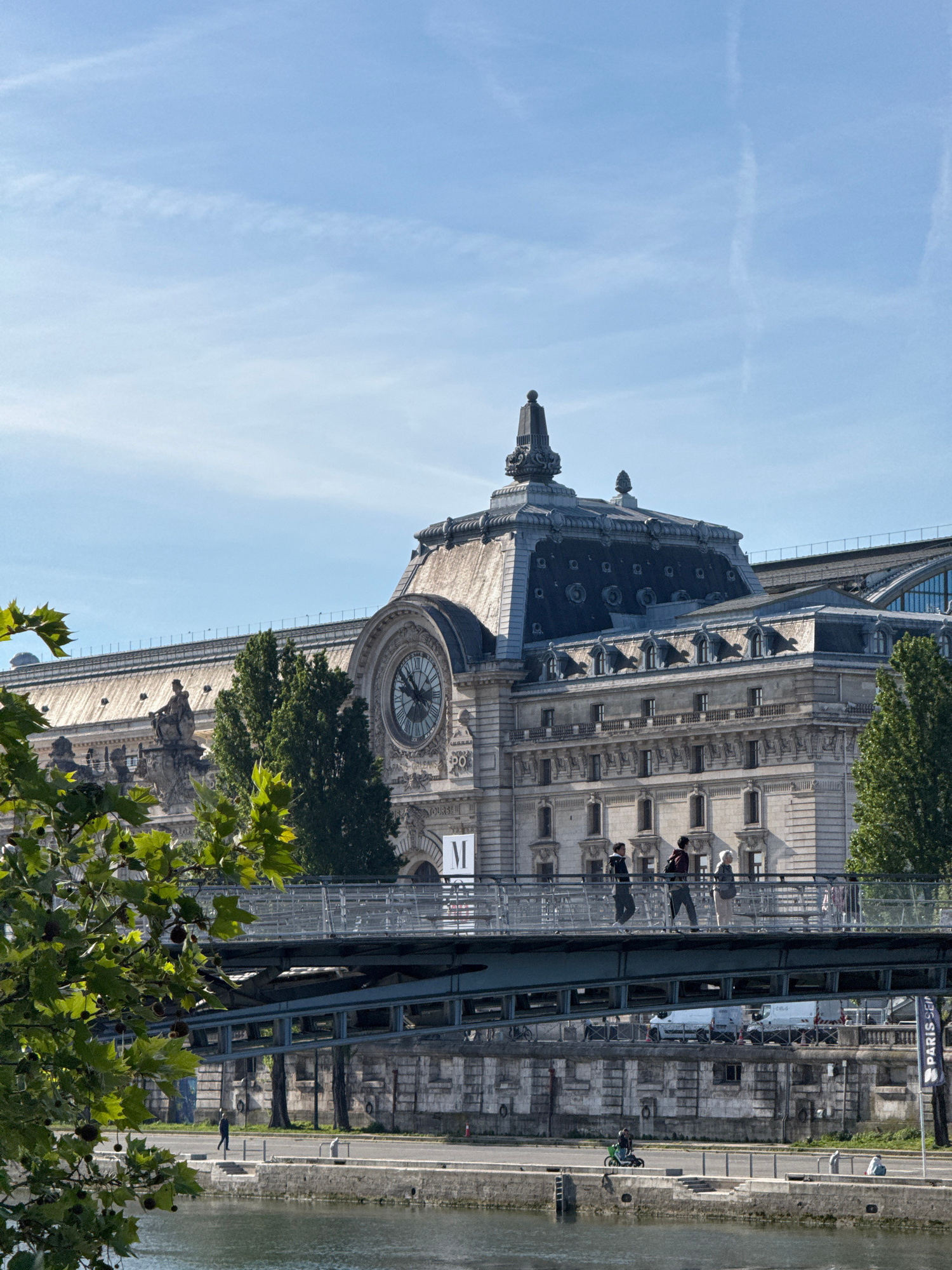 The image captures a partial view of the Musée d'Orsay in Paris, France, from a slightly low angle. The museum's distinctive architecture is visible, including its clock tower and ornate façade. A bri…read more