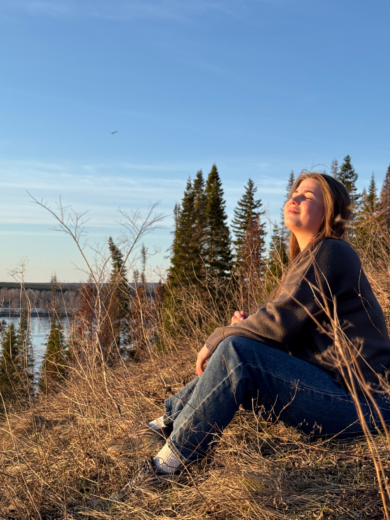 A young woman is sitting on a grassy hill in what appears to be a natural environment. She is wearing a dark sweater and blue jeans, with white sneakers. The backdrop includes pine trees and a body of…read more