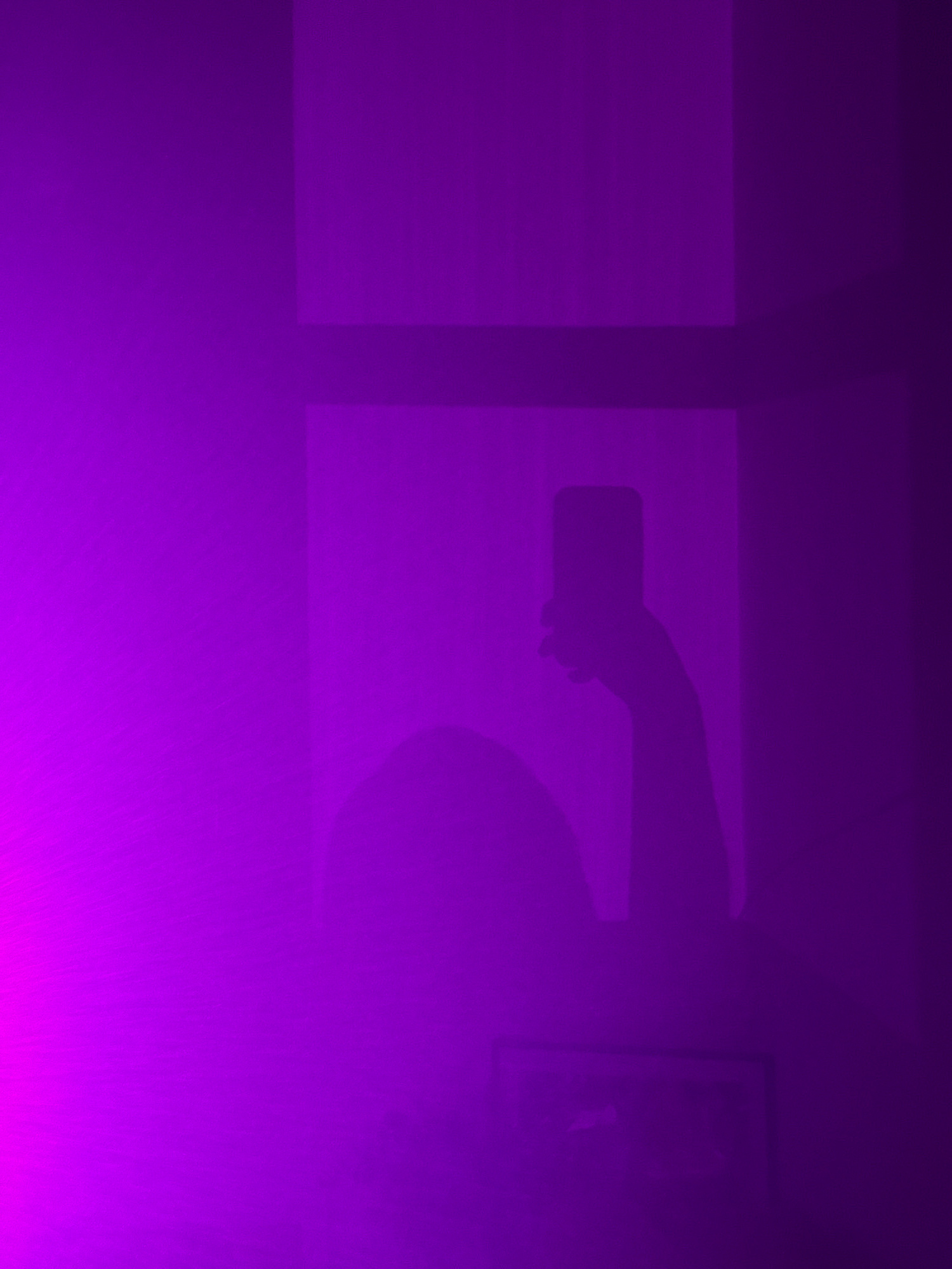 The image presents an indoor scene drenched in a monochromatic deep purple light. The primary subject is the shadow of a human arm and hand, stretching across the middle of the frame from left to righ…read more