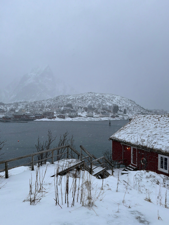 This image depicts a snow-covered winter scene in Reine, Norway, under overcast skies with active snowfall. In the foreground, a snow-covered hillside is visible. Bare, dark plant stalks protrude fro…read more