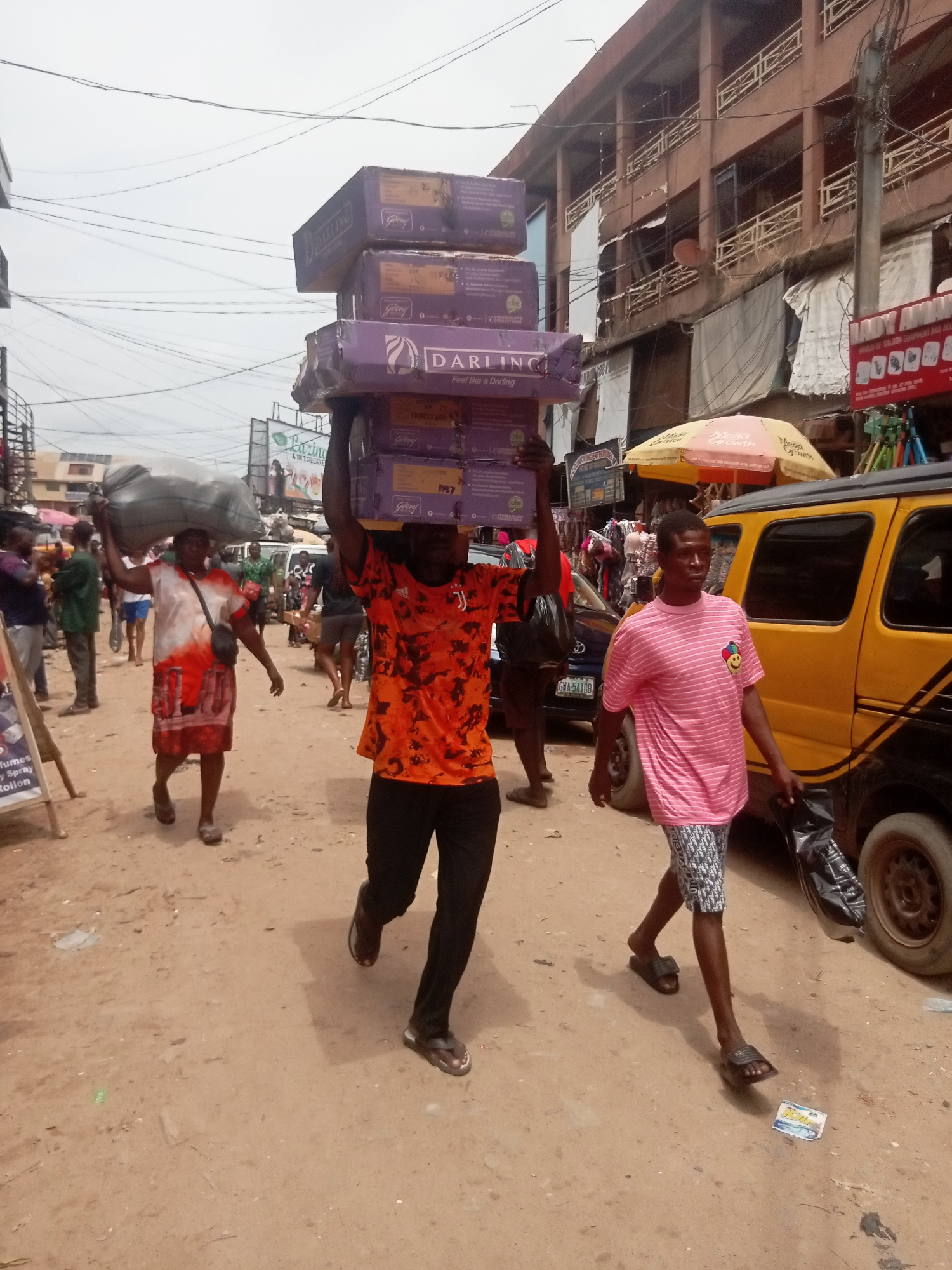 In a bustling marketplace in Fegge, Nigeria, a man in an orange patterned shirt and black pants carries a stack of purple boxes on his head. The boxes are labeled "Darling" and "Godrej." Next to him,…read more