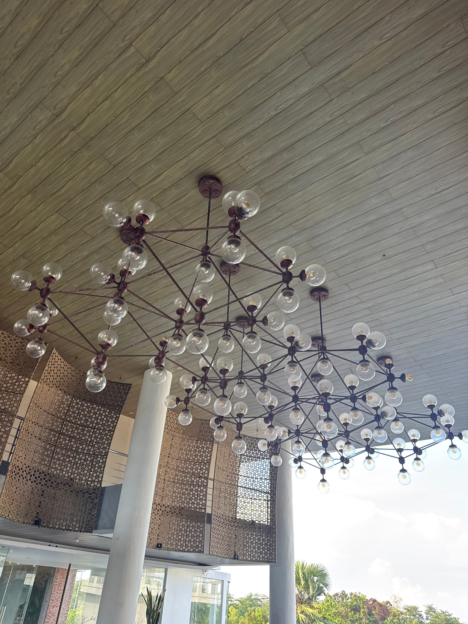 The image depicts the interior of a building in Pecatu, Indonesia. A large, multi-tiered chandelier with numerous clear glass bulbs and a bronze-colored metal frame dominates the foreground. The chand…read more