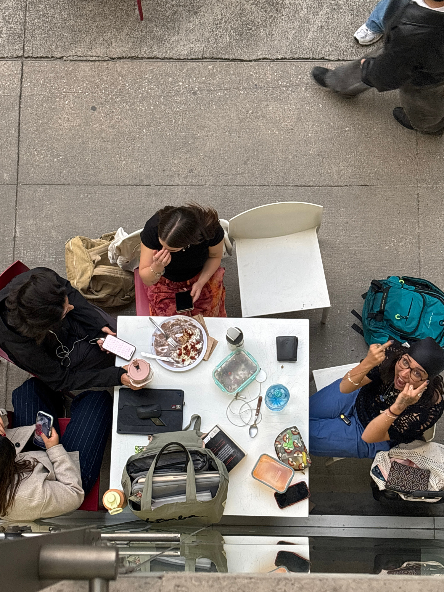 This image, captured from an overhead perspective and rotated ninety degrees clockwise, presents a vibrant outdoor scene, likely a cafe or eatery in Mexico City, during the daytime. The setting featur…read more