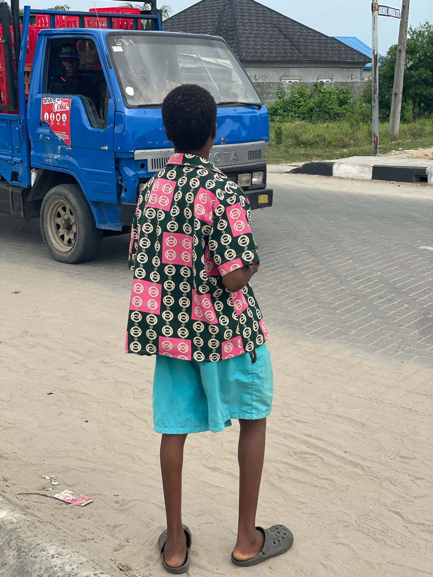 A medium shot depicts a young male standing next to a blue Toyota truck in Badagry, Nigeria. The truck is parked on a sandy shoulder adjacent to a paved road marked with a black and white curb. The tr…read more