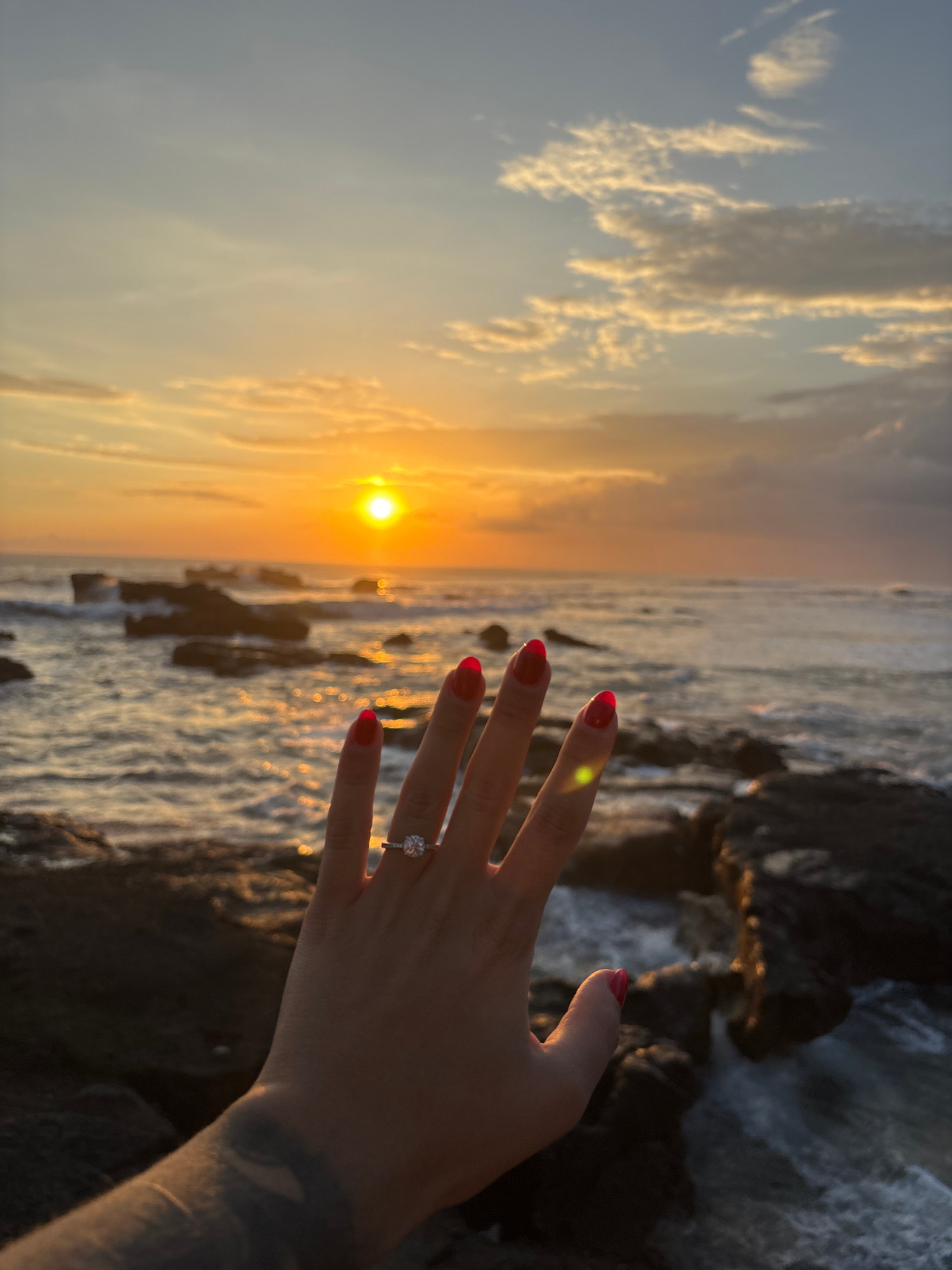 A photograph, rotated 90 degrees, depicts a sunset scene from Mengwi, Indonesia. A woman's hand with red nail polish and a diamond ring is prominently displayed in the foreground. The hand appears to…read more