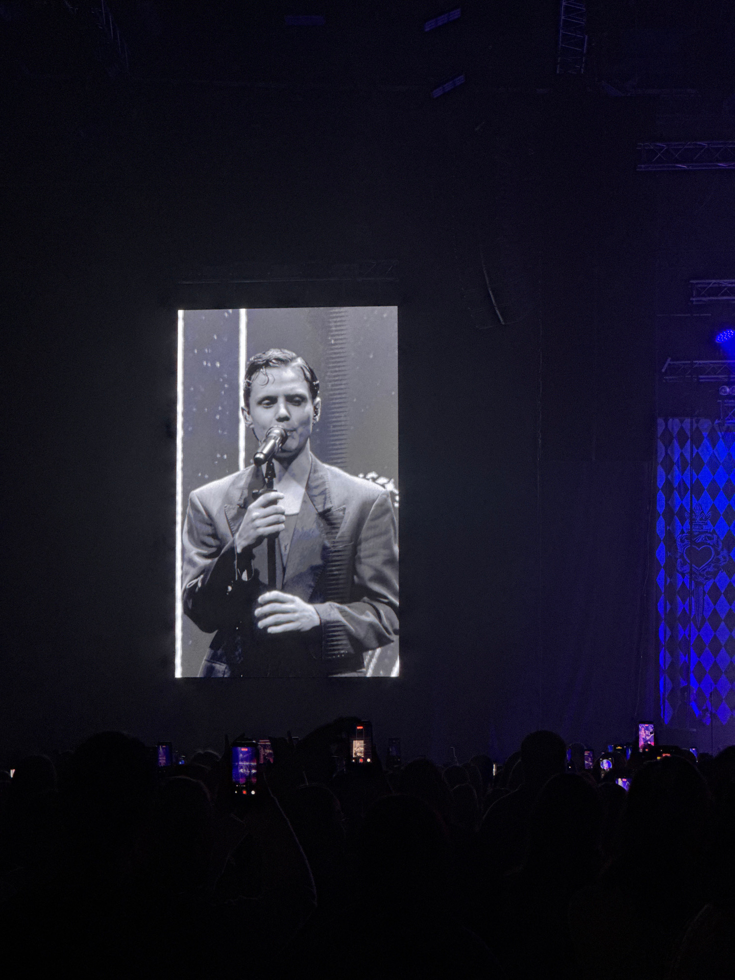 The image depicts a live music event, possibly a concert, in an indoor venue. A large screen displays a black-and-white image of a male singer holding a microphone. To the right of the screen, silhoue…read more