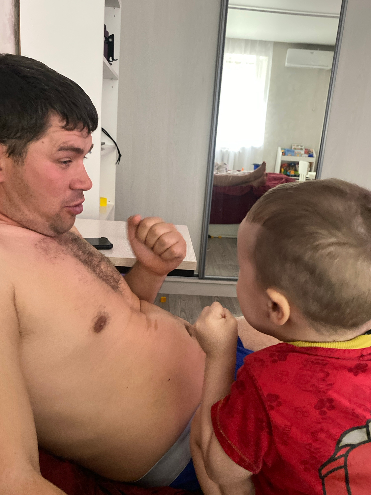 The image captures a playful moment between an adult male and a young child in an indoor setting. The adult male is lying on his back, partially shirtless, with dark hair and some chest hair. He is lo…read more