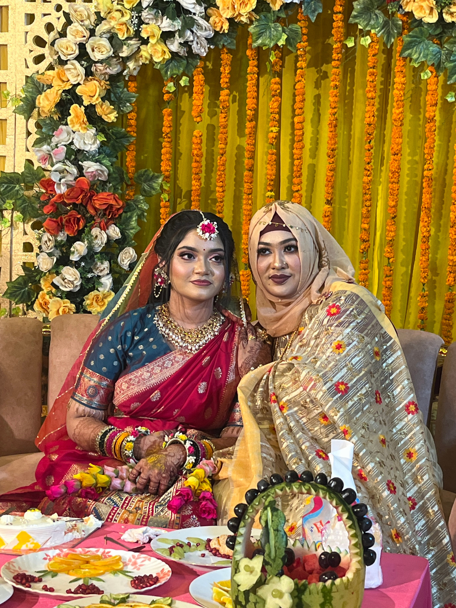 The image depicts two women seated on a brown cushioned sofa in an indoor setting in Savar, Bangladesh, characterized by celebratory decorations. The backdrop features a bright yellow fabric draped wi…read more