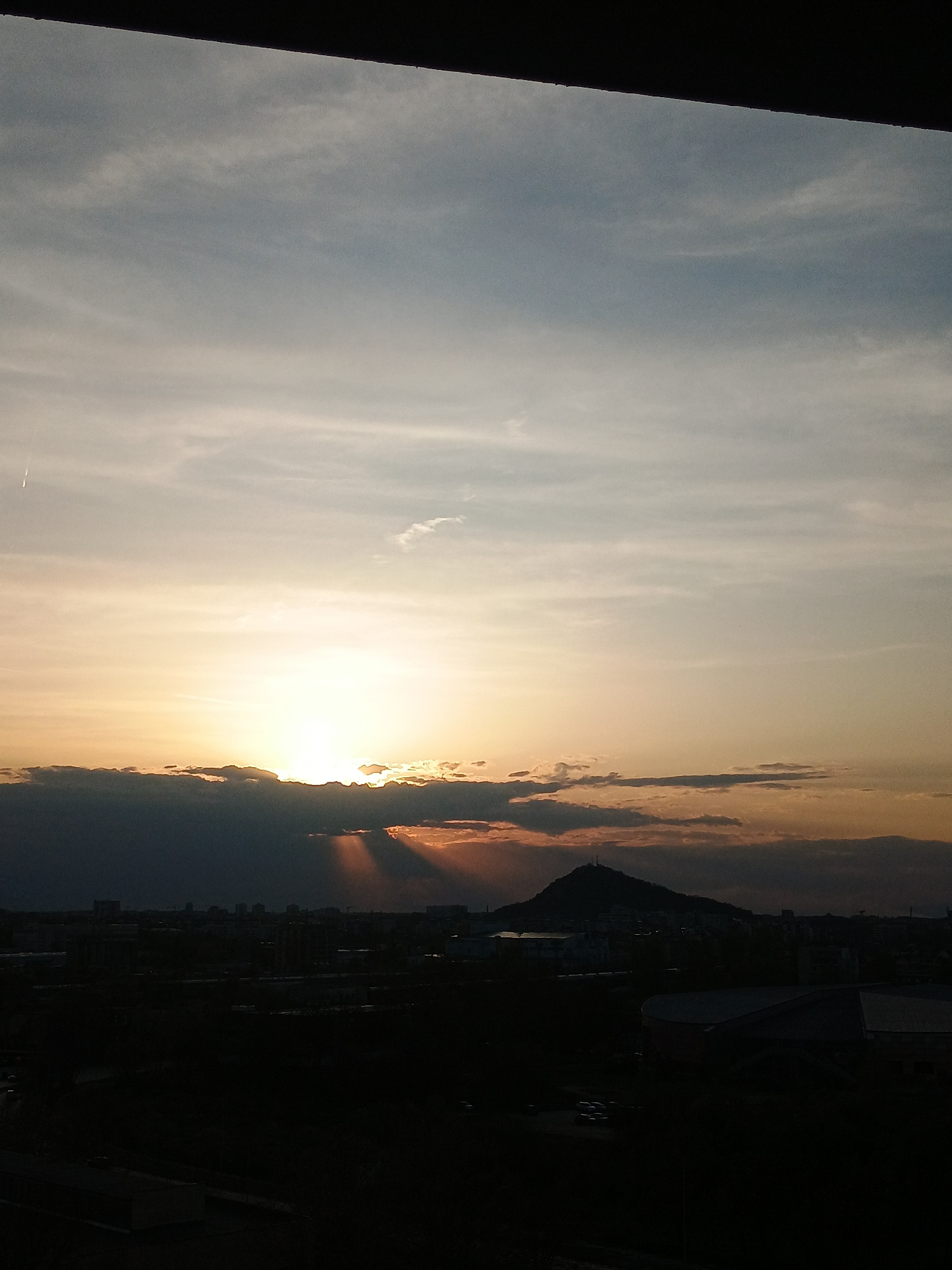 The image depicts a sunset over Plovdiv, Bulgaria, with the setting sun obscured by clouds on the horizon. Sunbeams are visible. The silhouette of the city skyline, including a hill or mountain (likel…read more