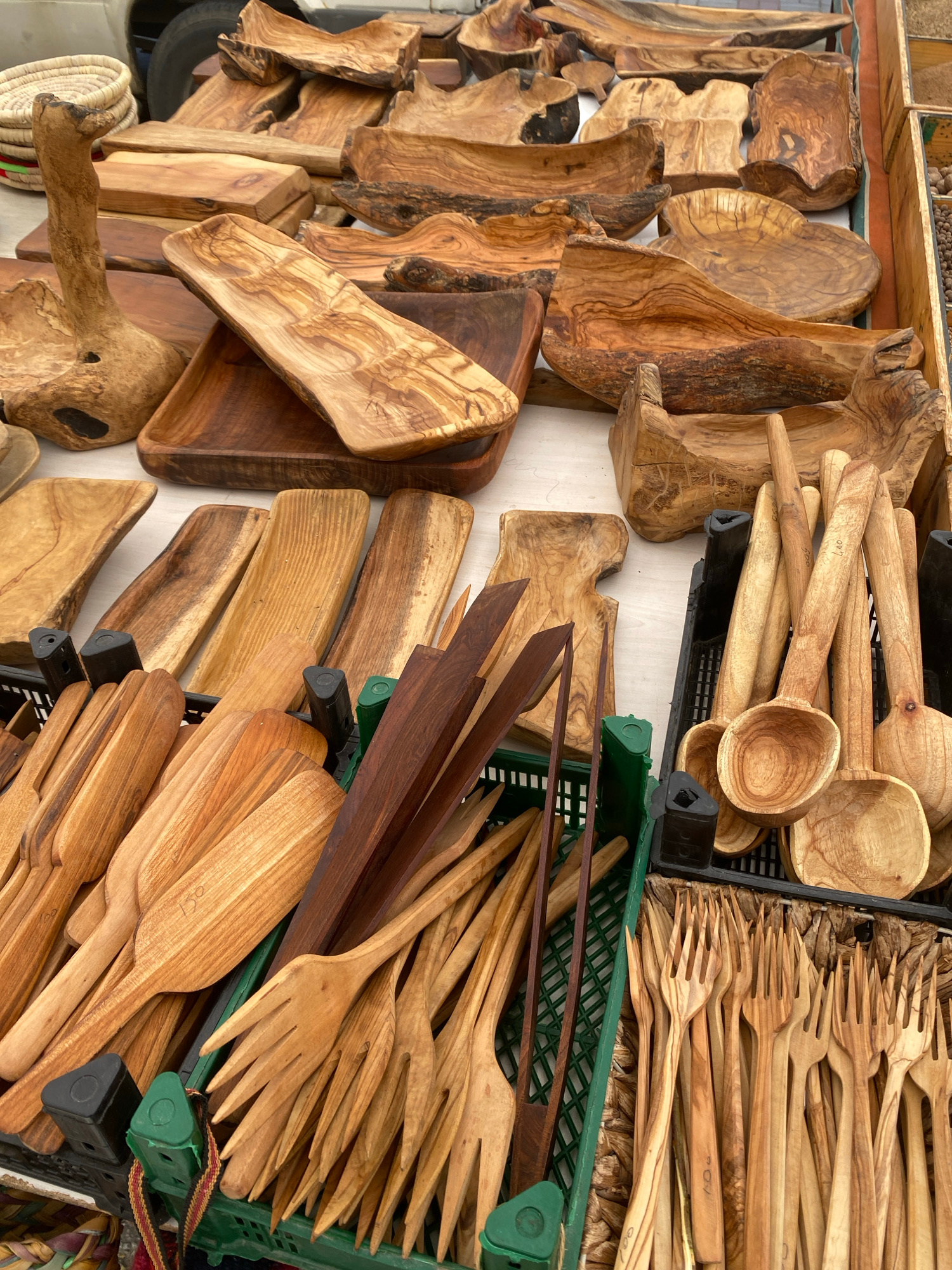 A high-angle, eye-level shot shows an outdoor display of handcrafted wooden kitchen utensils for sale, likely at a market or shop, possibly in Alanya, Turkey. The items, resting on a white surface, inβ¦read more