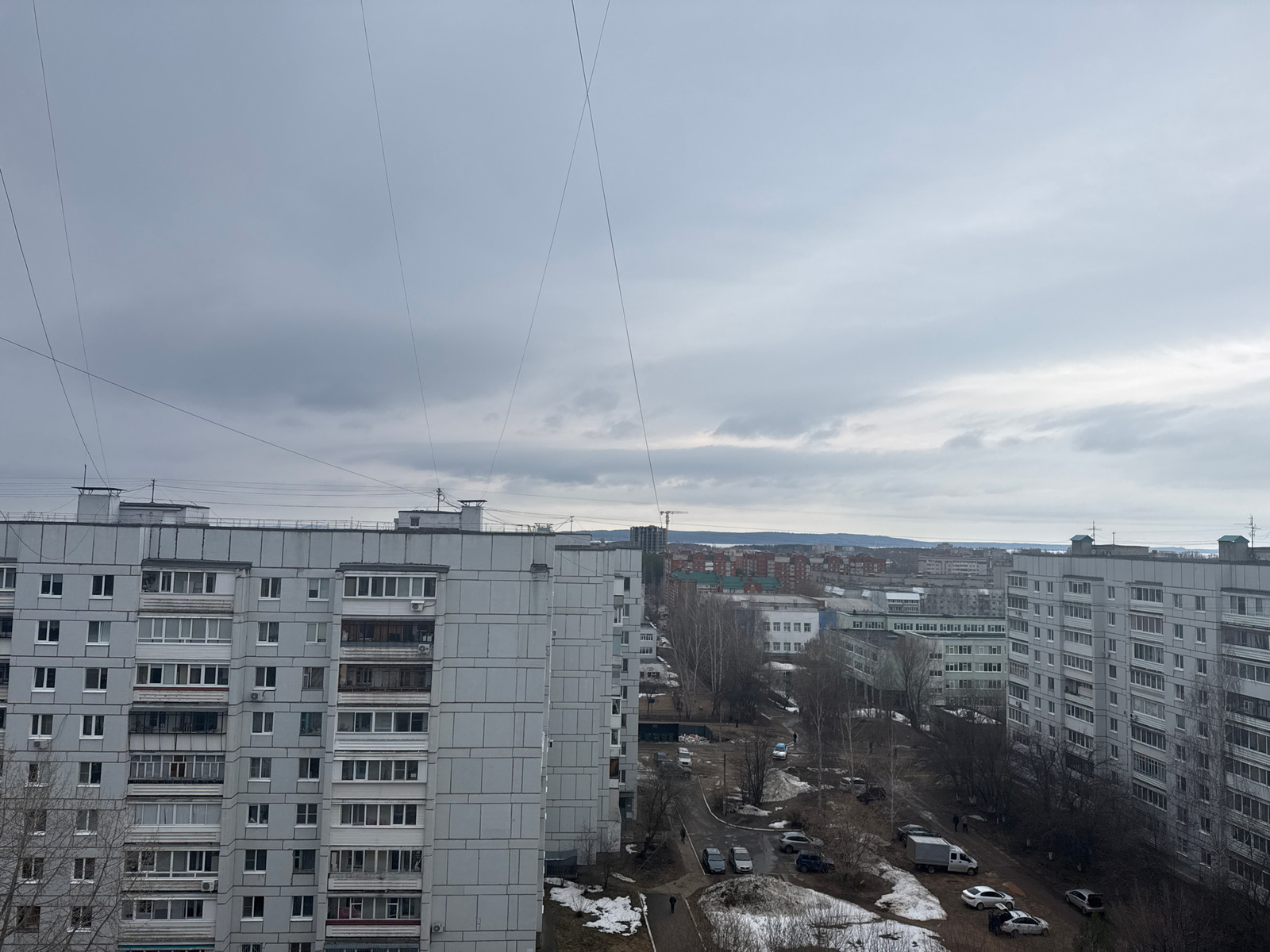 An elevated perspective of a residential area in the city of Chaikovsky, Russia, on an overcast day. In the foreground, two grey concrete apartment buildings flank a view of a street below. The streetβ¦read more