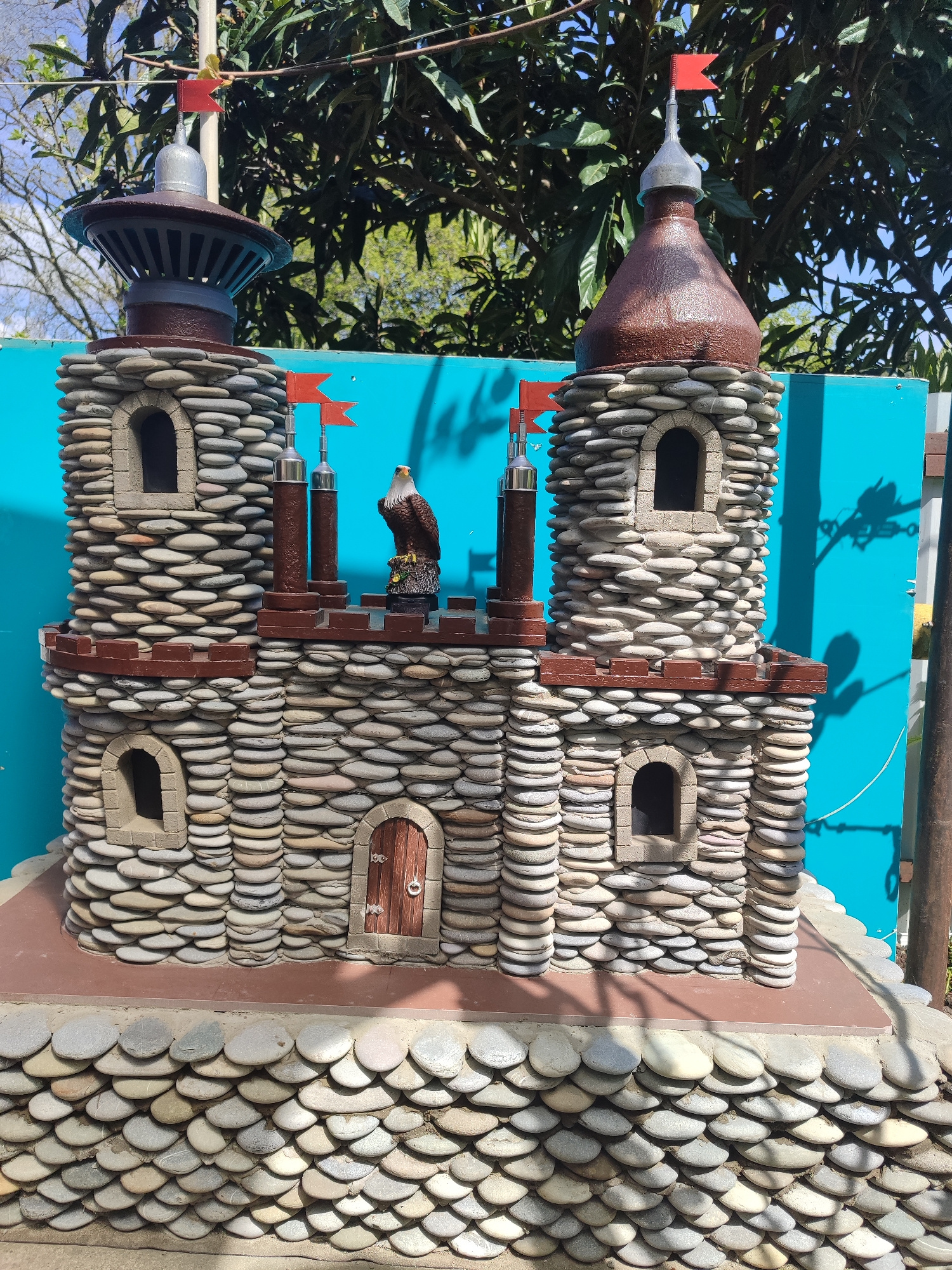 The image shows a decorative stone castle with two towers, a central section, and a base, likely located in an outdoor setting in the city of Unknown, Unknown. The castle is constructed from rounded s…read more