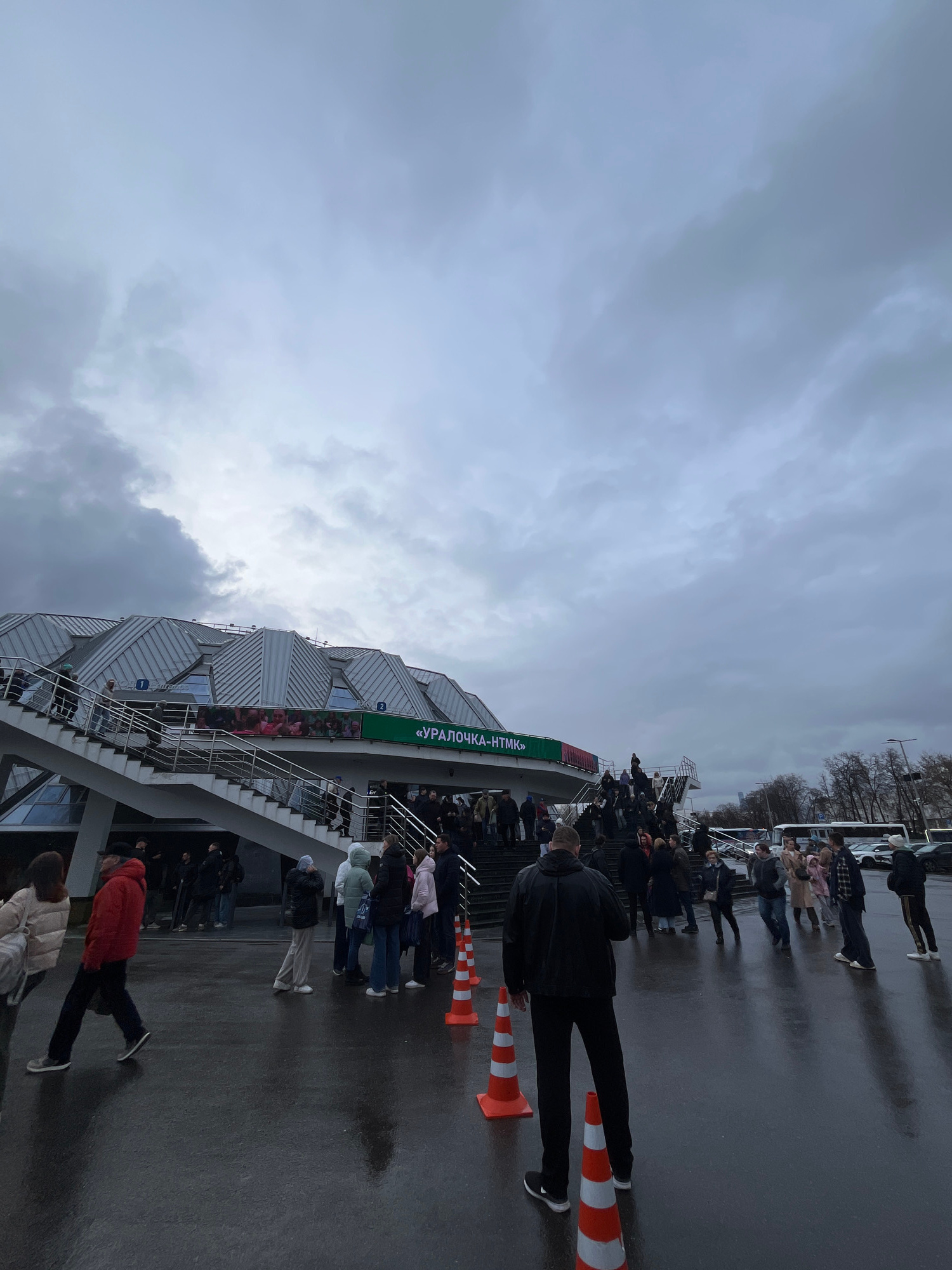 The image depicts a crowd of people queued near a stadium, with an architectural style of modern metal and glass elements. Signage on the building reads "УРАЛОЧКА-НТМК". Orange and white cones are vis…read more