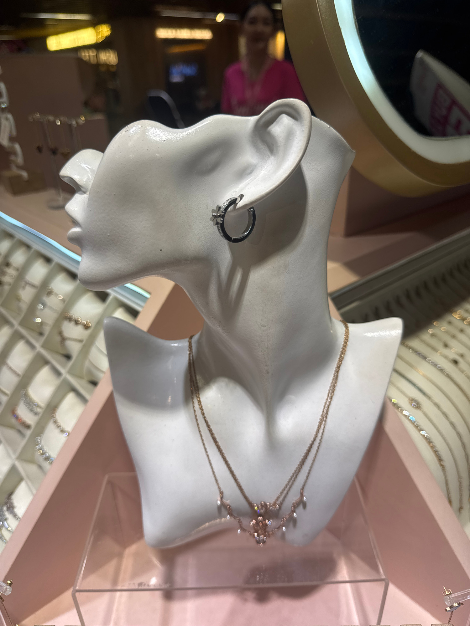 The image features a white, stylized mannequin bust, resembling a head and upper torso, prominently displaying jewelry in what appears to be a retail setting. On the mannequin's left ear, a silver-ton…read more