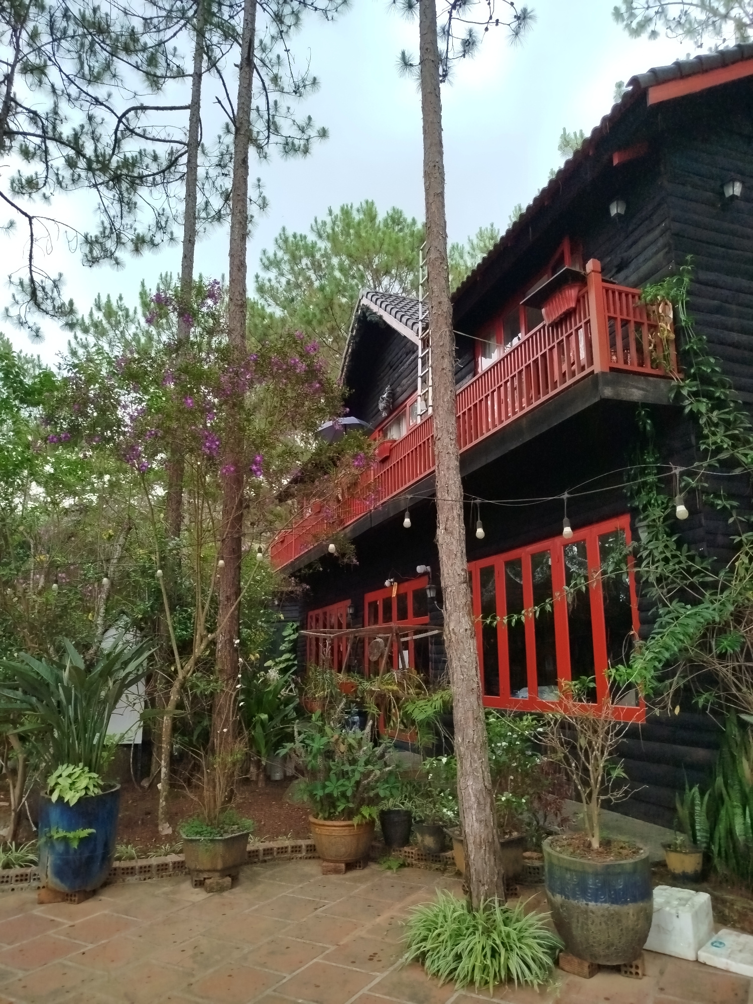 The image captures a two-story wooden house with red trim, likely located in Da Lat, Vietnam, known for its unique architecture. The house features a balcony on the upper level with red railings and a…read more