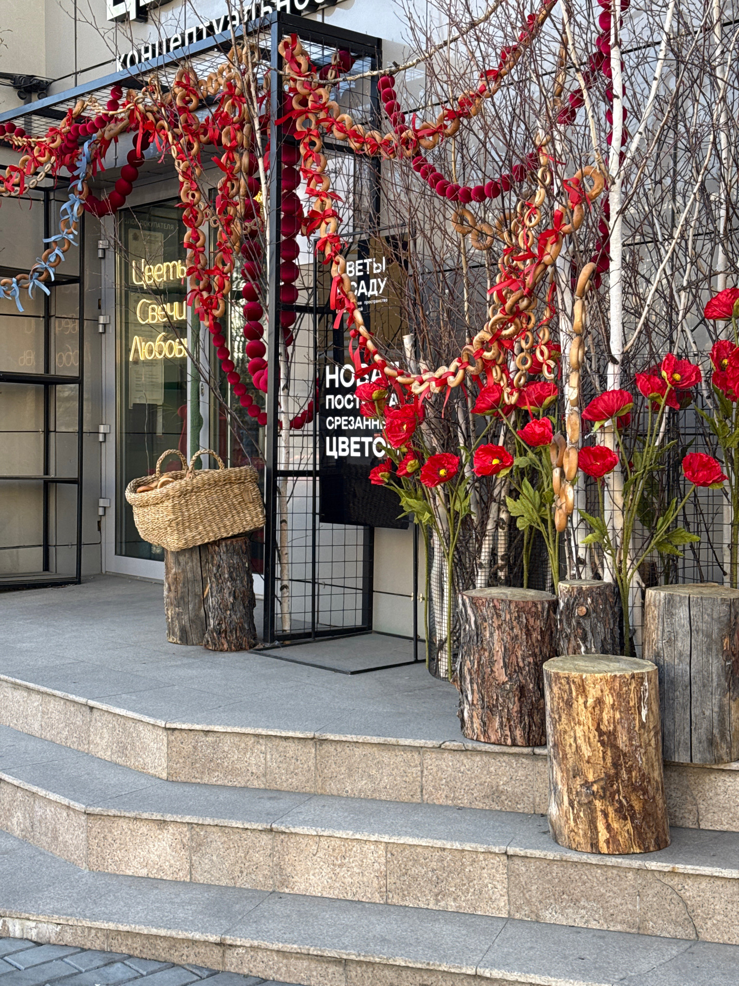 The image shows the entrance to a flower shop in Chita, Russia. The entrance is decorated with tree branches, strung with bagels and red ornaments, and red artificial flowers. The displays are positio…read more