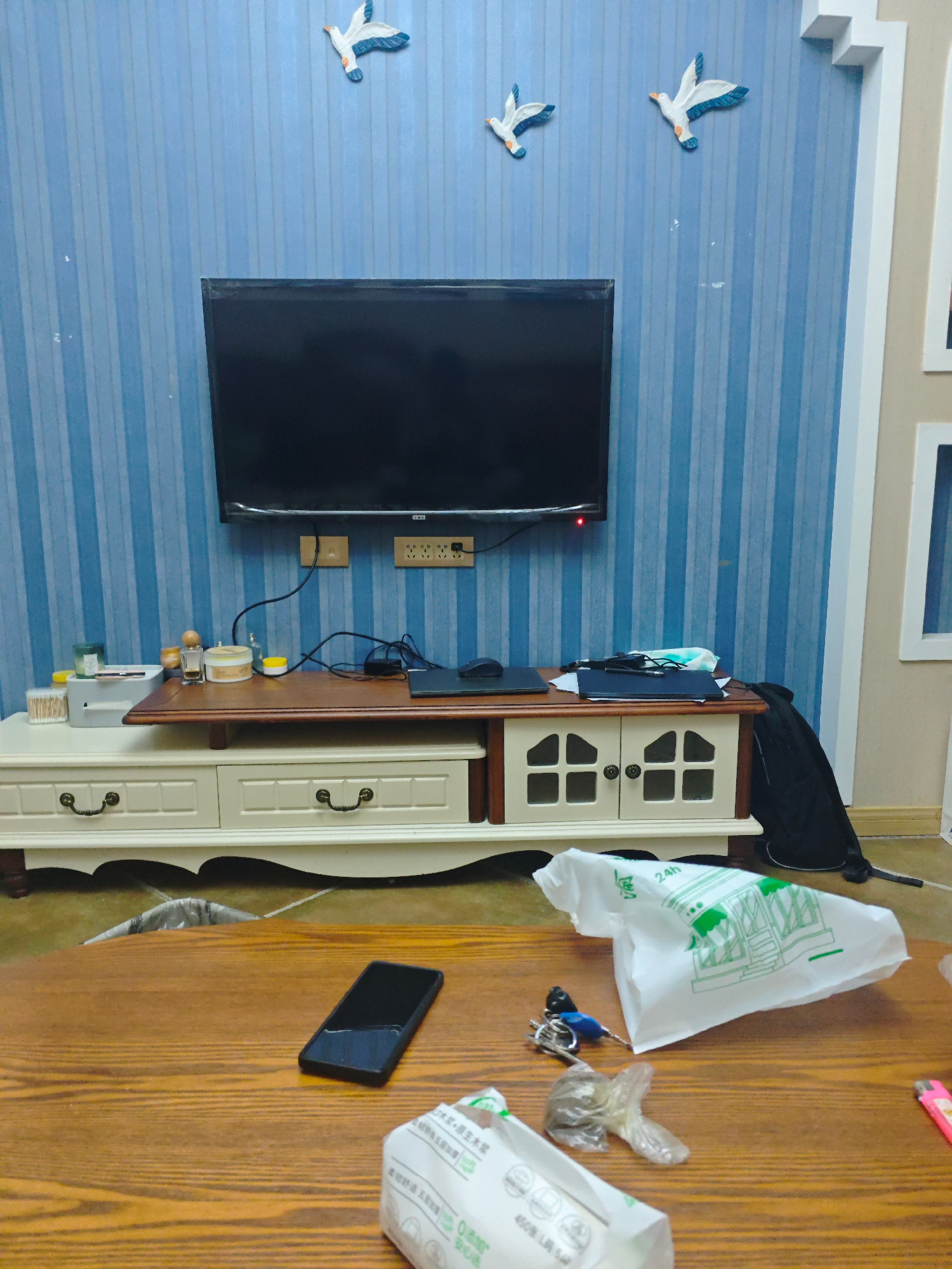 The image shows a room in Chongqing High-tech Zone, China. The scene is centered on a wooden table in the foreground cluttered with personal items. A black smartphone, a set of keys, a clear plastic b…read more