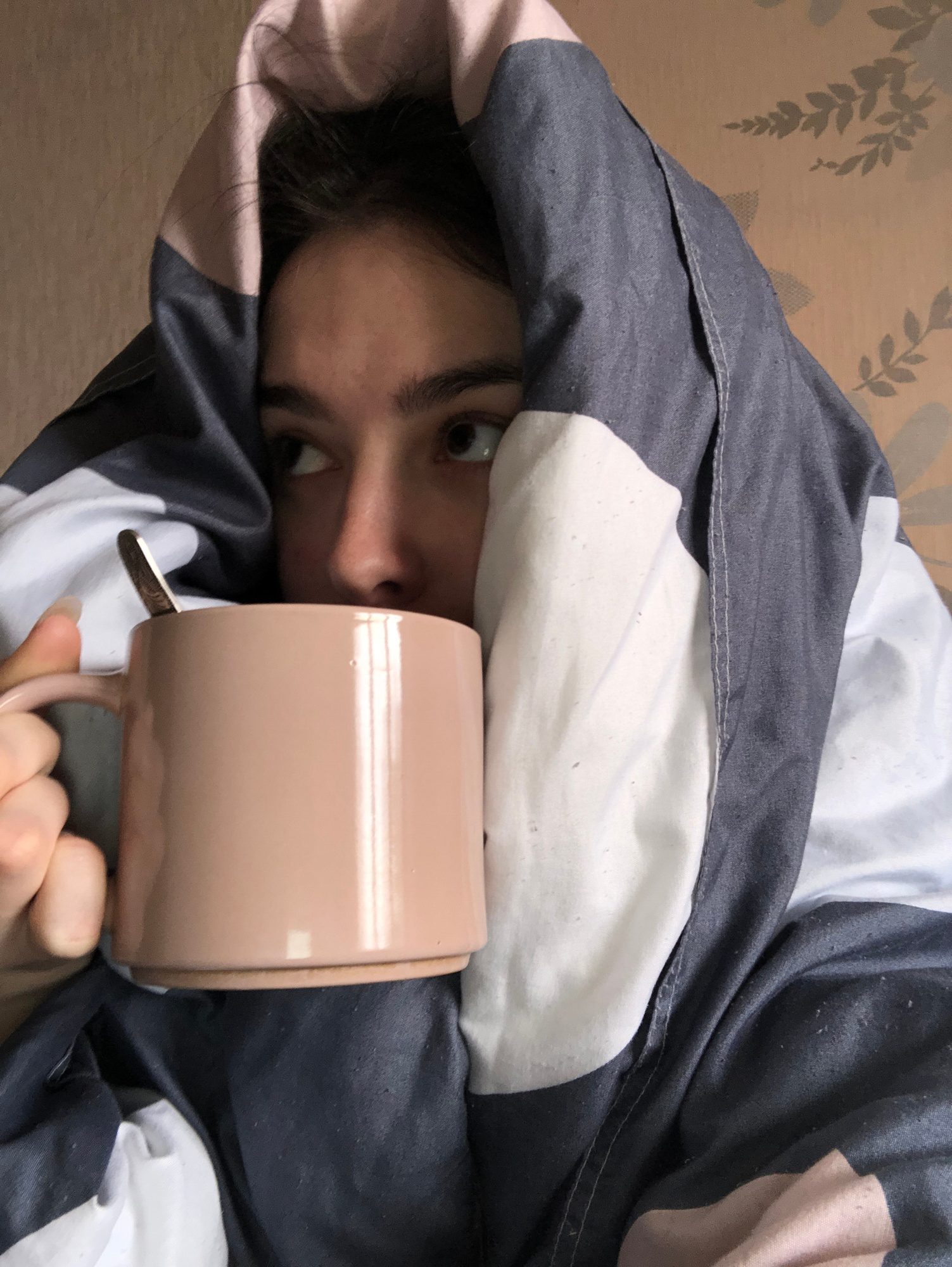 A woman lies in bed, partially covered by a grey, white, and pink duvet. Her eyes are visible, looking slightly downward. A light brown ceramic mug with a spoon inside is held up to her face. The back…read more