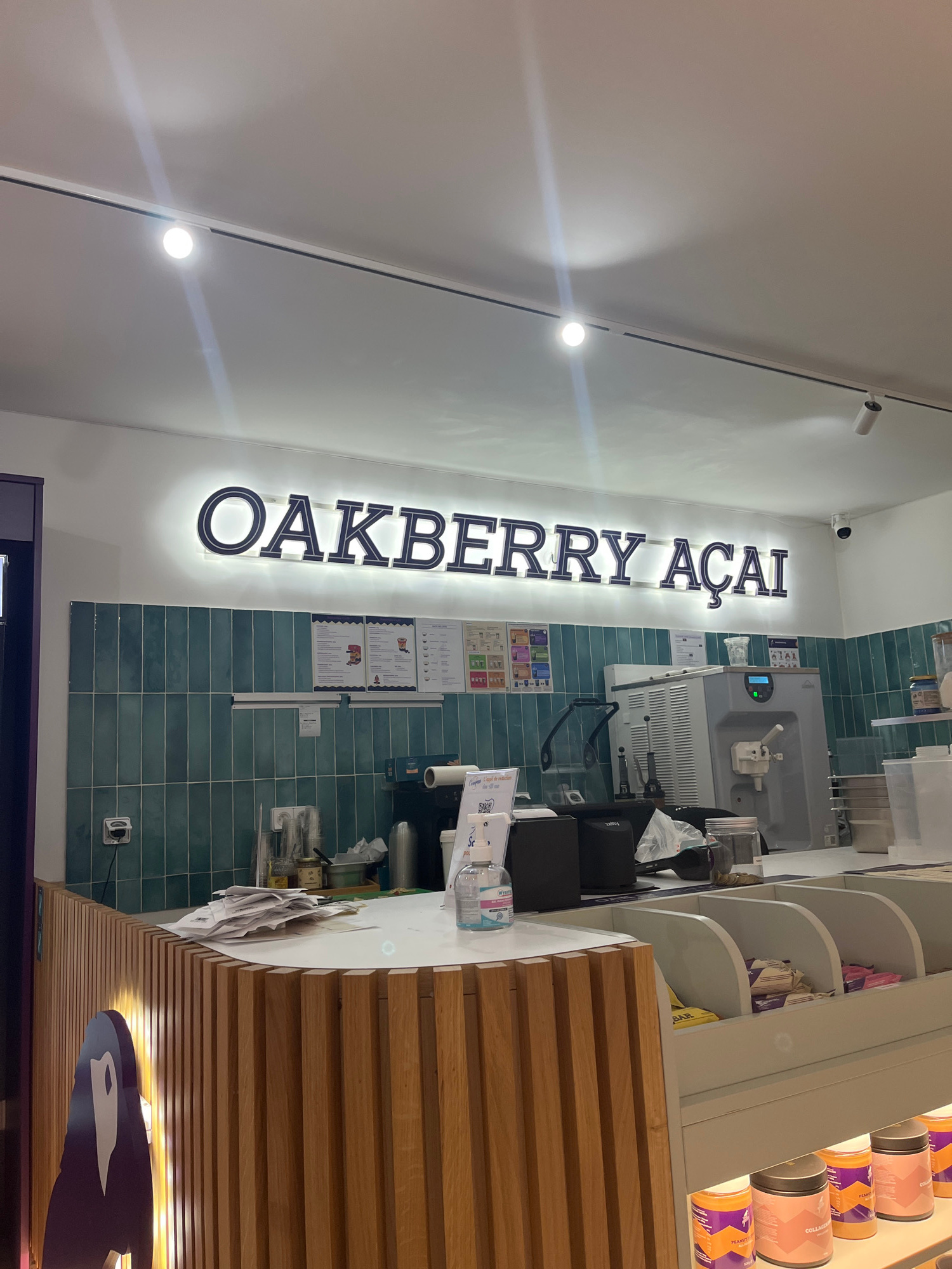 The image shows the interior of an Oakberry Açaí store, possibly in Lyon, France (though this cannot be definitively confirmed without further information). The store's name, "OAKBERRY AÇAI," is promi…read more