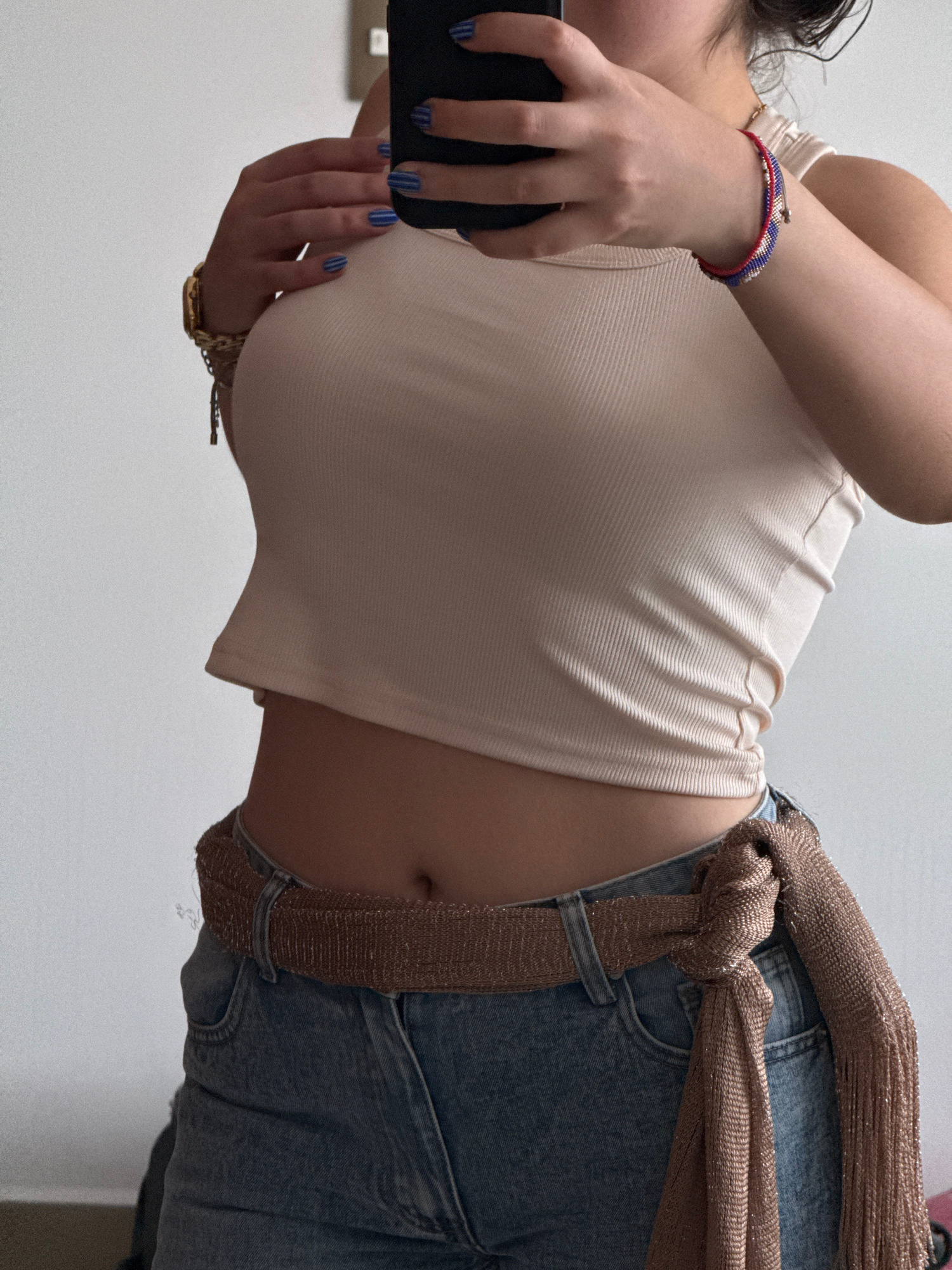 A person wearing a cream-colored, ribbed tank top and light blue jeans is seen from the side, holding a black mobile phone in their left hand, which has blue nail polish. The jeans are cinched at the…read more