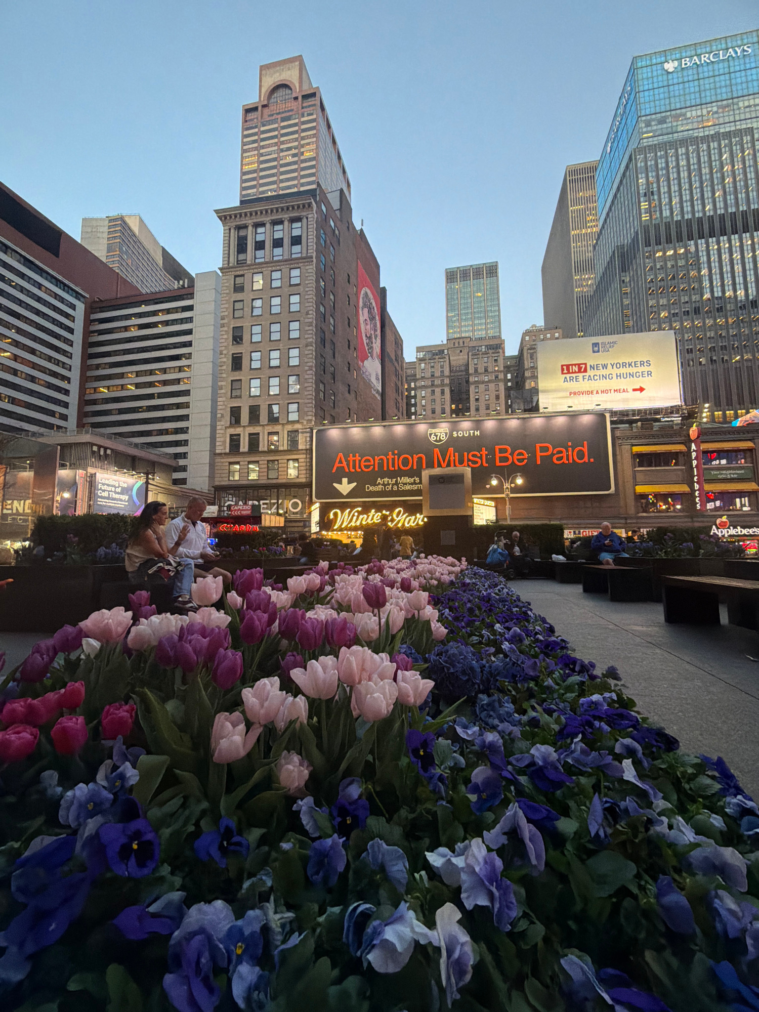The image depicts a street scene in New York City, with a focus on a flower bed containing a mix of tulips and pansies in shades of pink, purple, and blue. Buildings loom in the background, including…read more