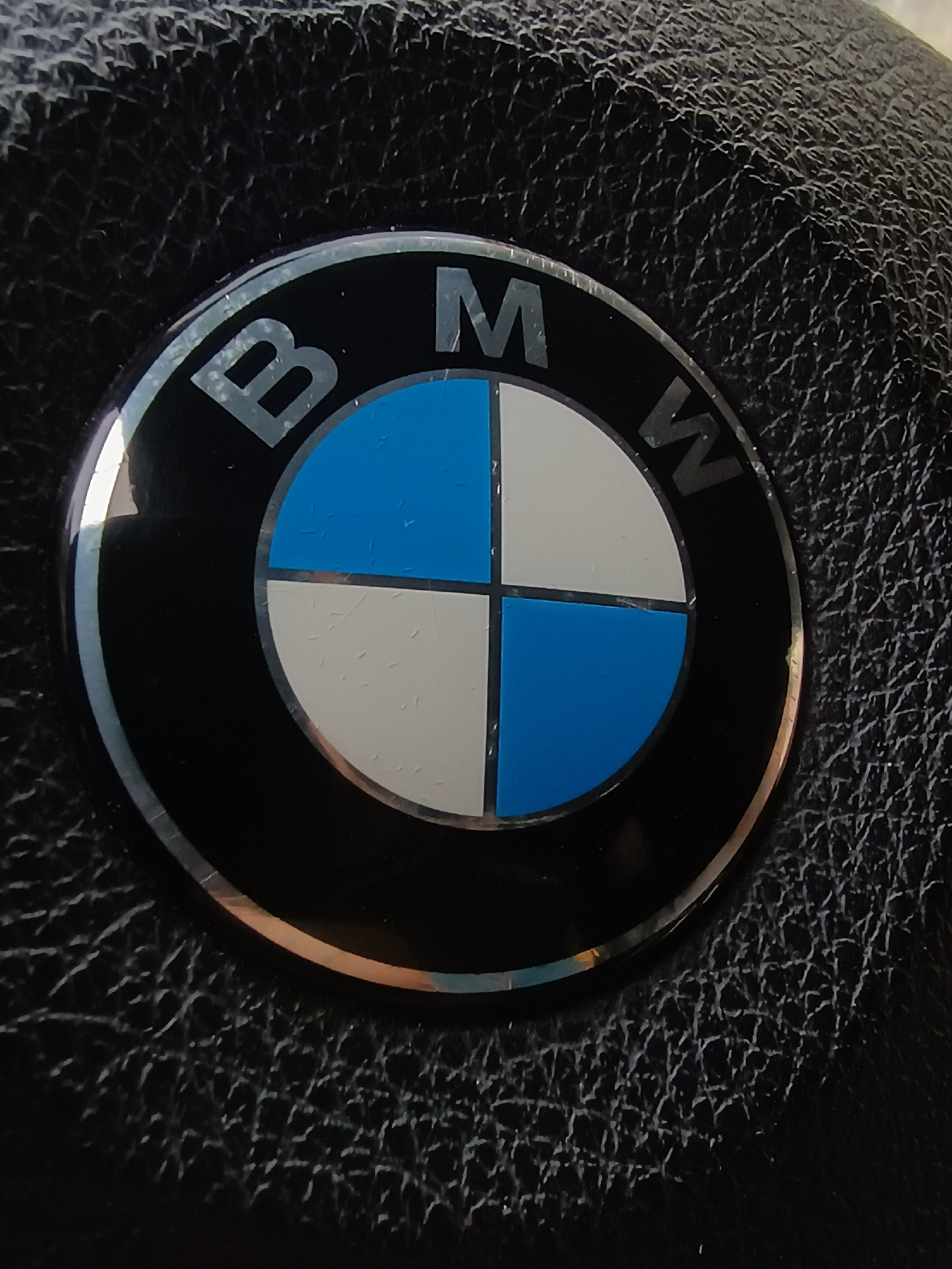 The image shows the BMW logo affixed to a textured black surface, likely leather or a leather-like material, suggesting it is part of a car interior, possibly the steering wheel or dashboard. The logo…read more
