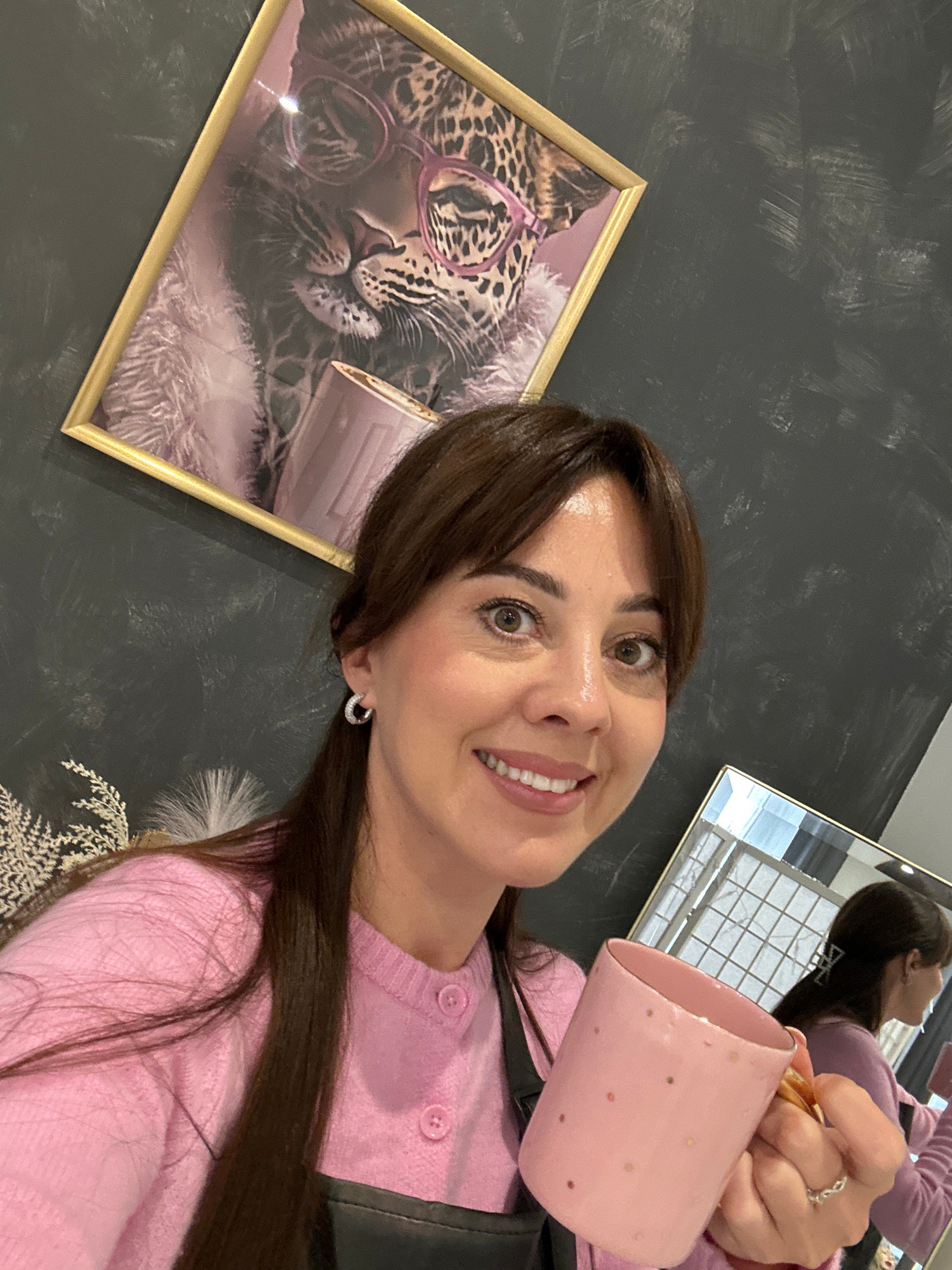 A woman is posing for a selfie in an indoor setting. She is holding a pink mug with gold polka dots in her right hand. The woman is wearing a pink cardigan and has long, straight brown hair. A framed…read more