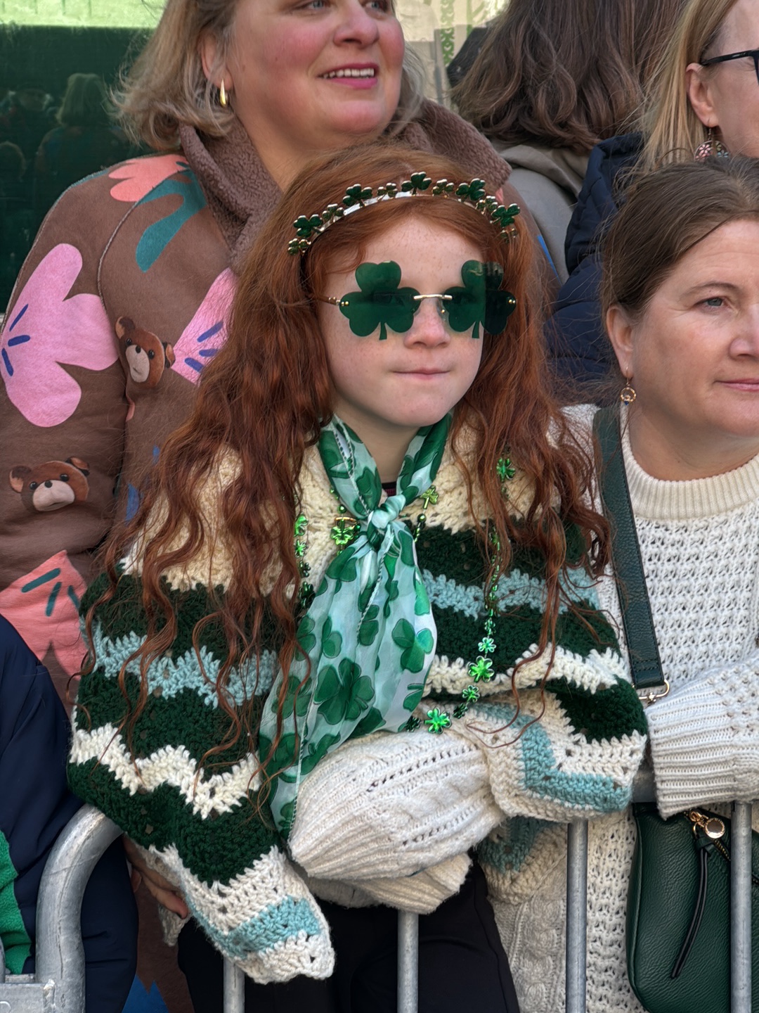 A young girl with long, curly red hair stands in the foreground, positioned behind a silver metal barrier and looking forward and slightly right. She wears green shamrock-shaped sunglasses, a gold-col…read more