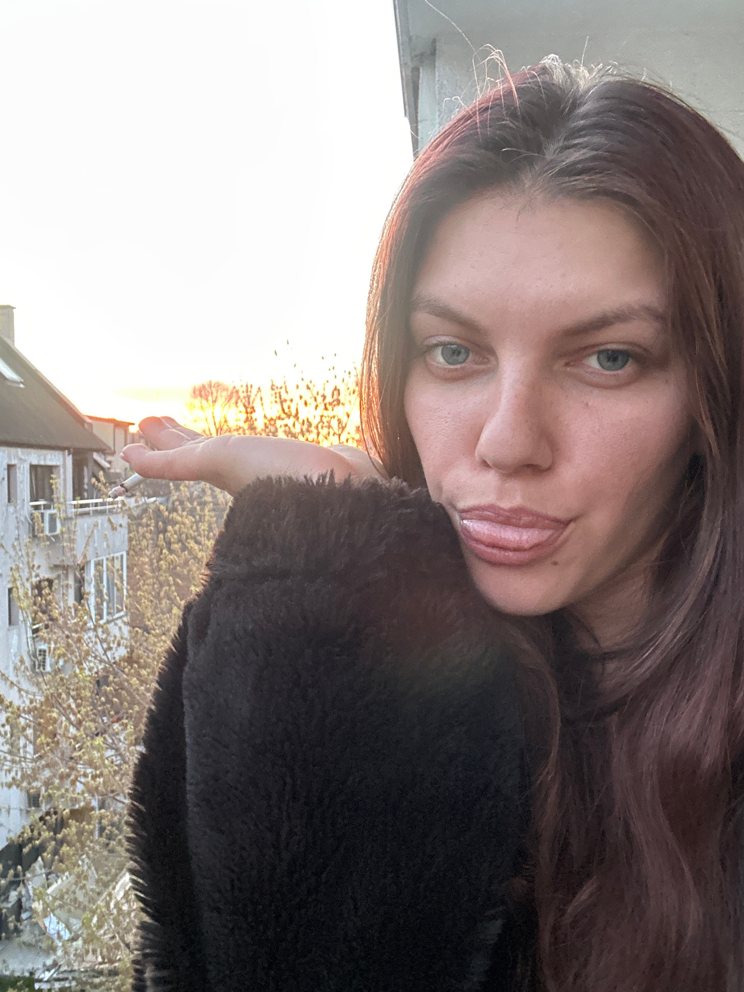 A woman with auburn hair, fair skin, and green eyes is looking at the camera, leaning on her left hand which is holding a lit cigarette. She is wearing a dark, furry garment. Outside, the buildings su…read more