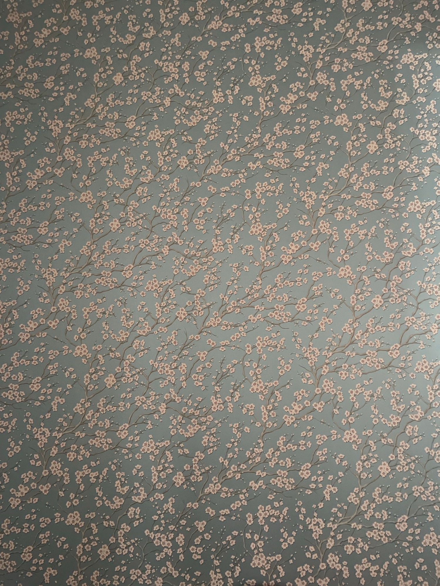 The image is a close-up of wallpaper with a floral pattern, reminiscent of cherry blossoms or similar small, delicate flowers. The background is a muted blue-gray color, and the flowers are a light pe…read more