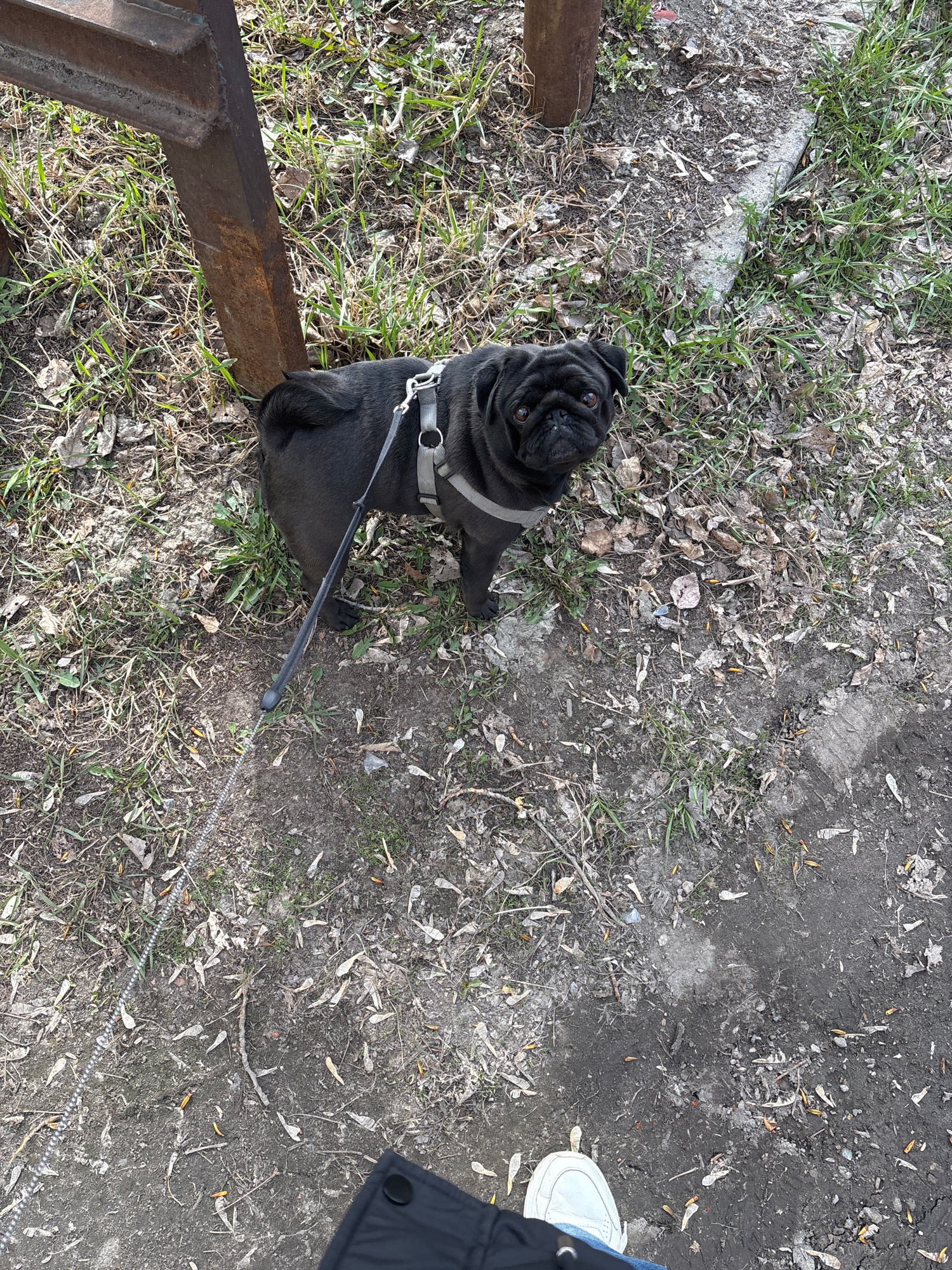 Captured in Shadrinsk, Russia, the image provides an overhead view of a black pug dog sitting outdoors. The pug is the central subject, wearing a grey harness with a leash extending from it. It is loo…read more