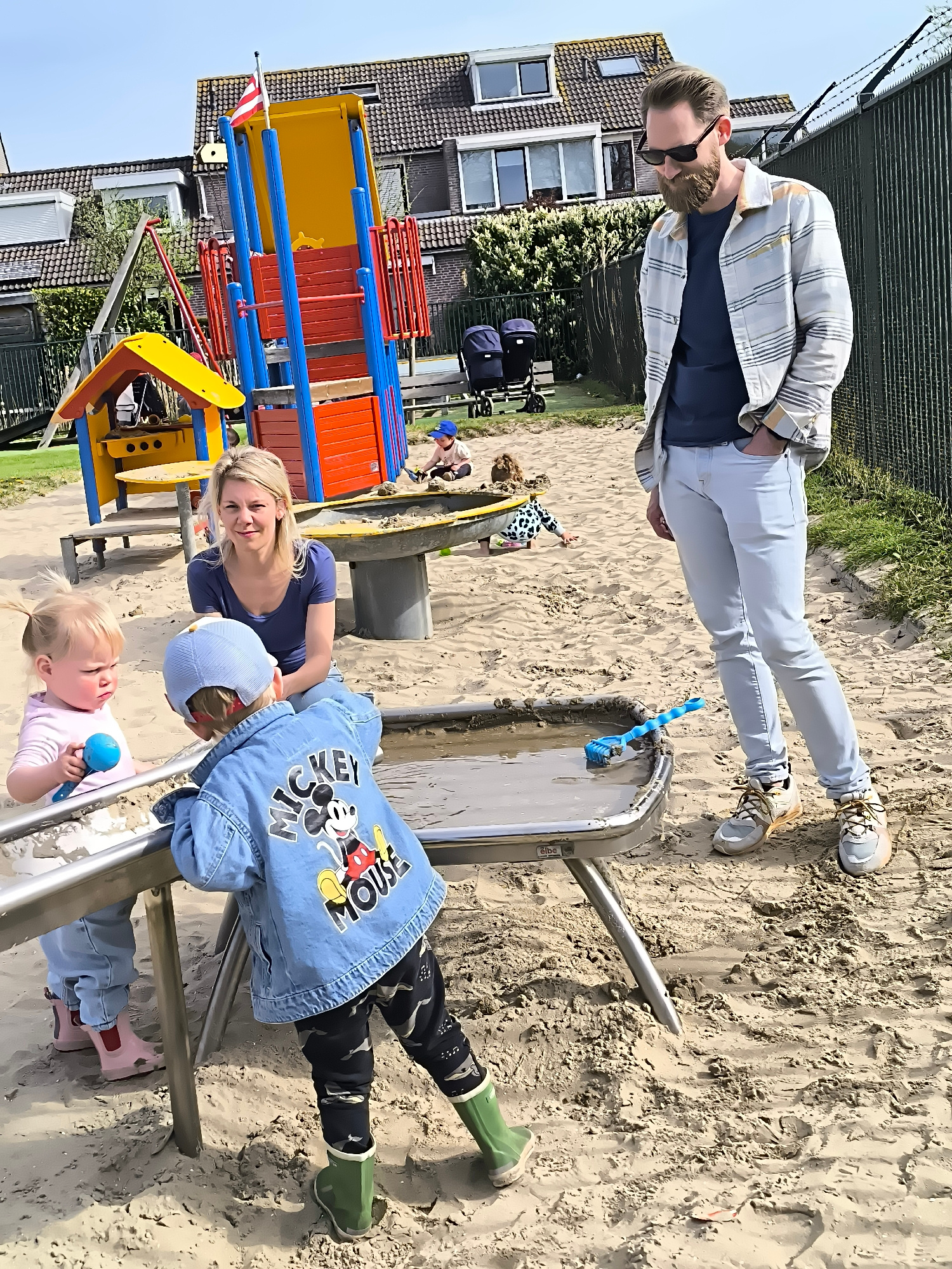 This image captures an outdoor playground scene in Alkmaar, Netherlands, on a bright, sunny day. The sandy ground serves as the main play area for several children and two adults. In the foreground,…read more