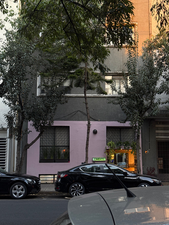 A multi-story building is seen with gray and lavender sections. Windows are visible on each floor. A tree with dense foliage partially obscures the view. A green sign reading "CIMENTO" vertically is a…read more
