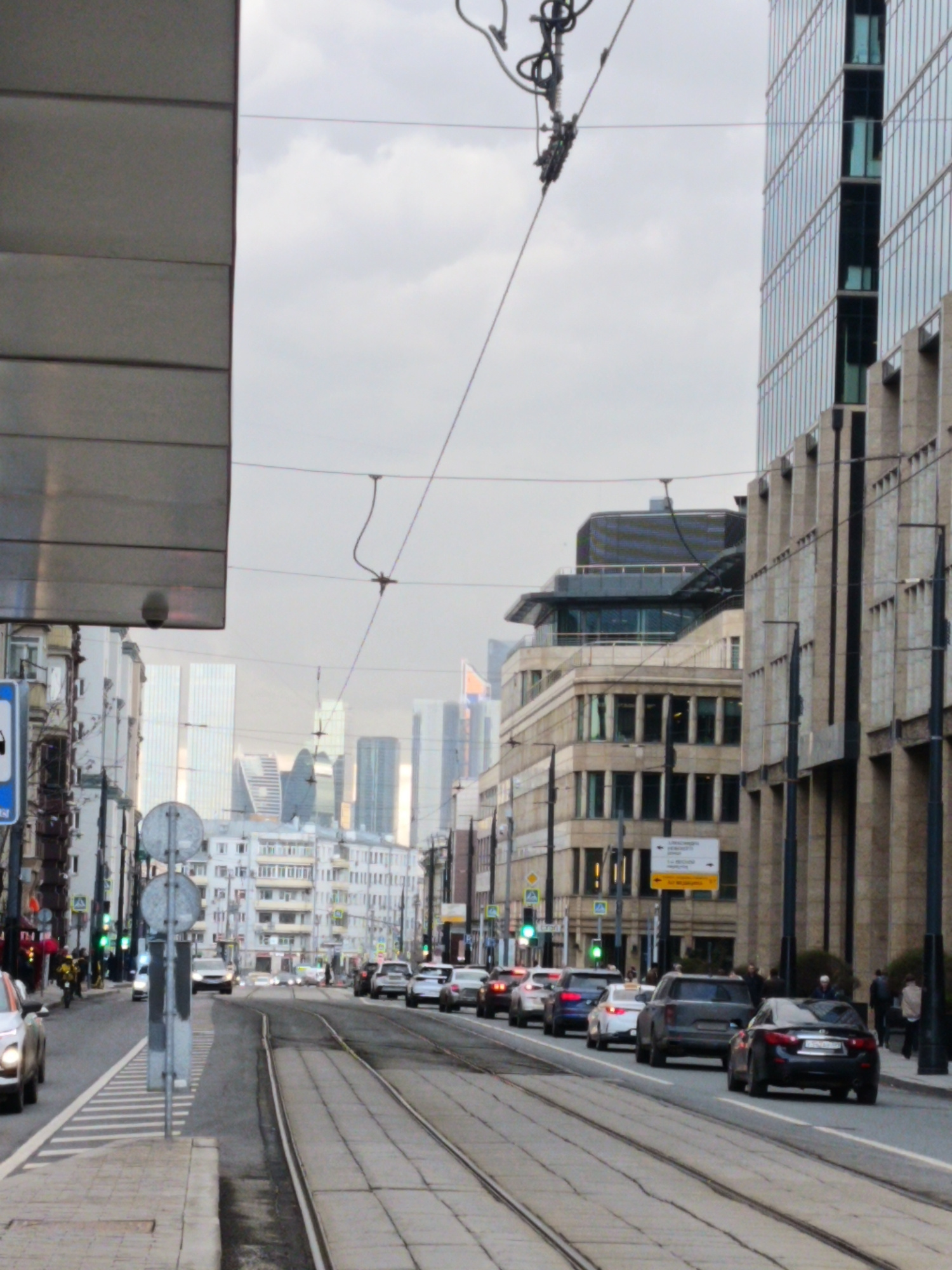 The image shows a street scene in Moscow, Russia, during the daytime. The sky is overcast. A wide street with tram tracks running down the center is lined with various buildings, including modern glas…read more