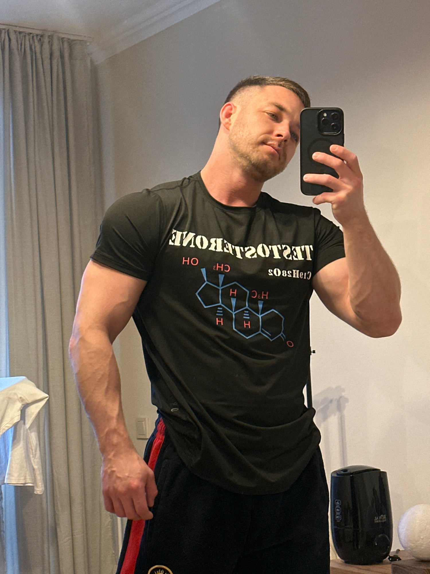 A man stands indoors, facing the camera while holding a smartphone in his left hand to take a selfie. He is wearing a black t-shirt with the word "Testosterone" printed backward on it and a chemical s…read more