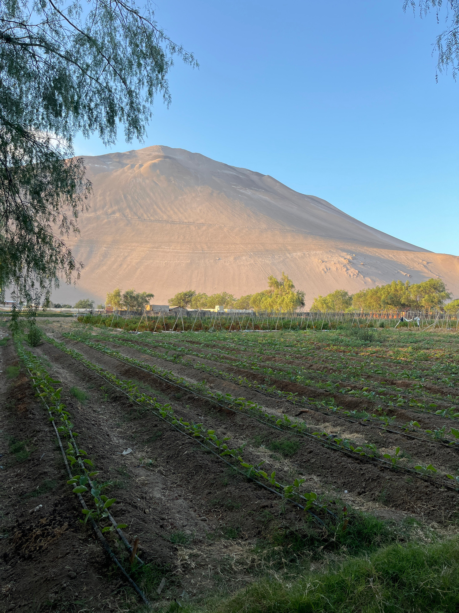 The image presents a landscape featuring agricultural fields bordering a large sand dune under a clear, blue sky. The agricultural fields are characterized by rows of young plants, likely crops, with…read more