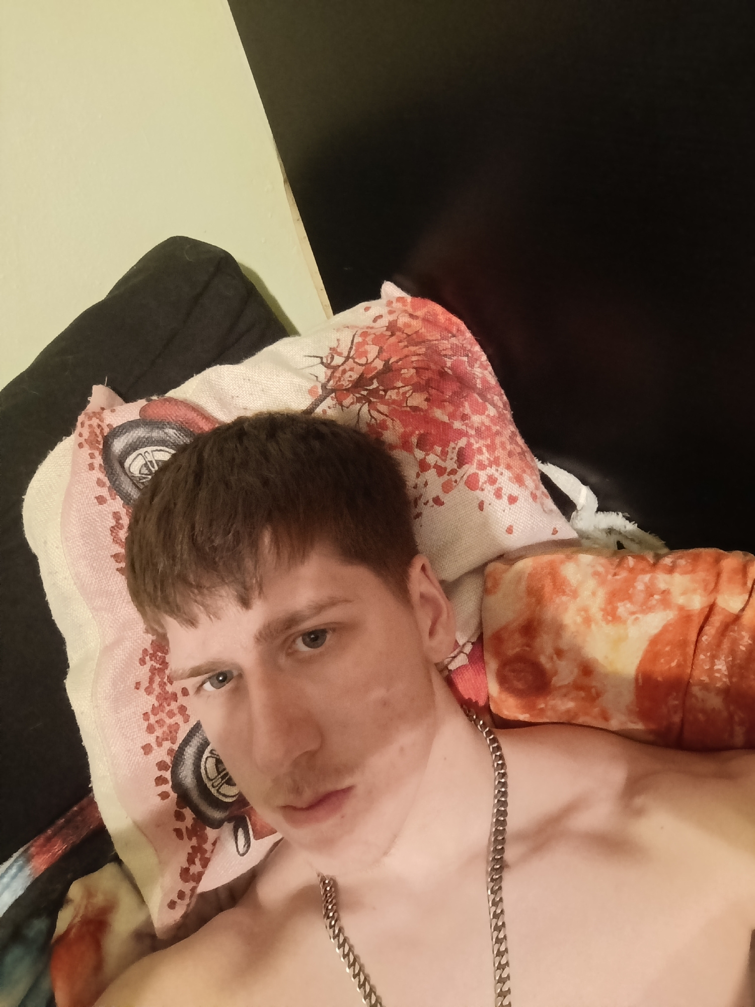 A fair-skinned, young adult male is lying on a pillow with a pizza slice print. He wears a silver chain necklace and is topless. The background consists of a black couch and off-white wall. There is n…read more