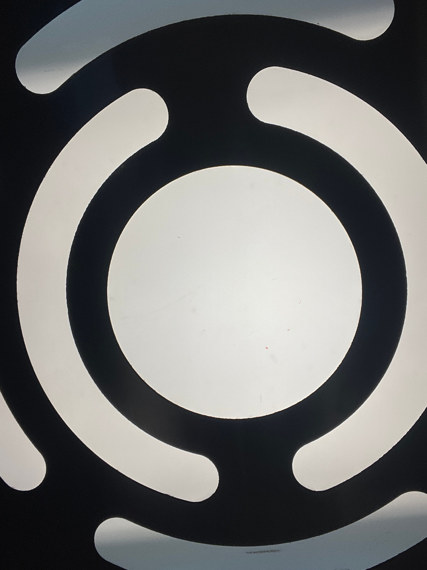 The image displays a high-contrast, abstract geometric pattern featuring illuminated white shapes against a uniform black background. Central to the composition is a large, perfectly circular white el…read more