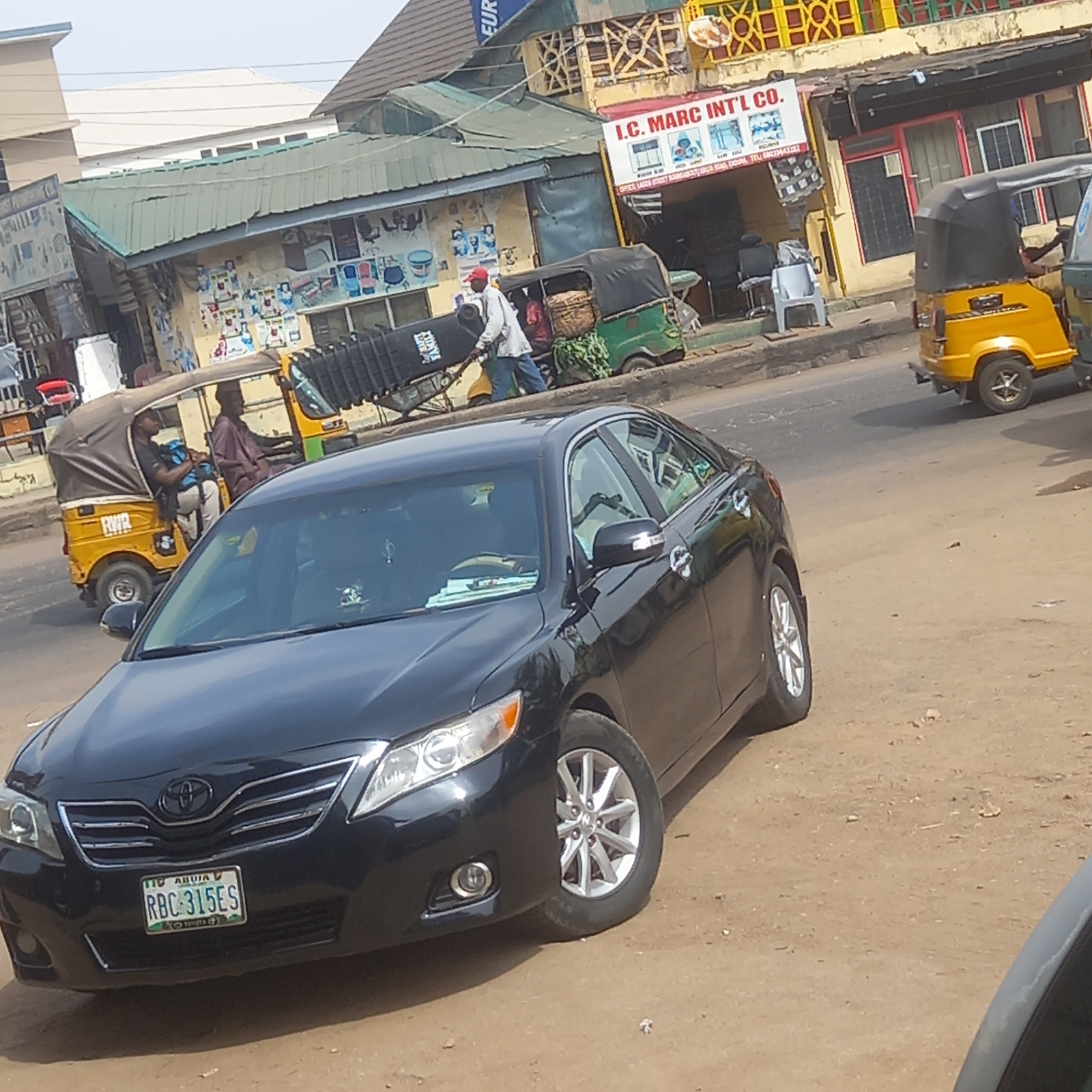 The scene depicts a street in what appears to be a commercial area in Dadi Riba, Nigeria. A black Toyota sedan with license plate RBC-315ES is parked on the street. Several yellow auto rickshaws, some…read more