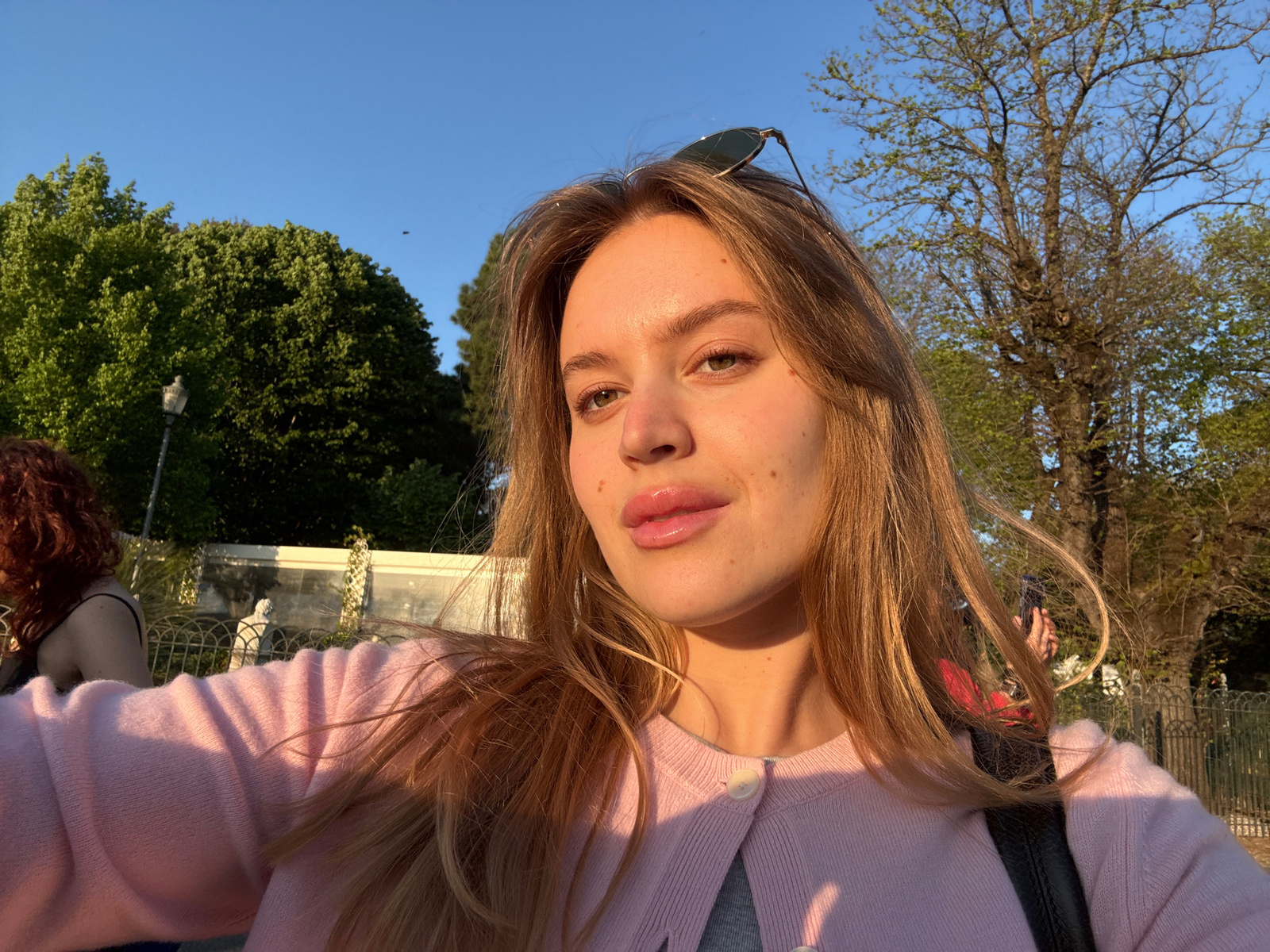 A selfie taken outdoors shows a woman with long, light brown hair wearing a light pink cardigan. Sunglasses are tucked into the neckline of her cardigan. The woman is situated in what appears to be a…read more
