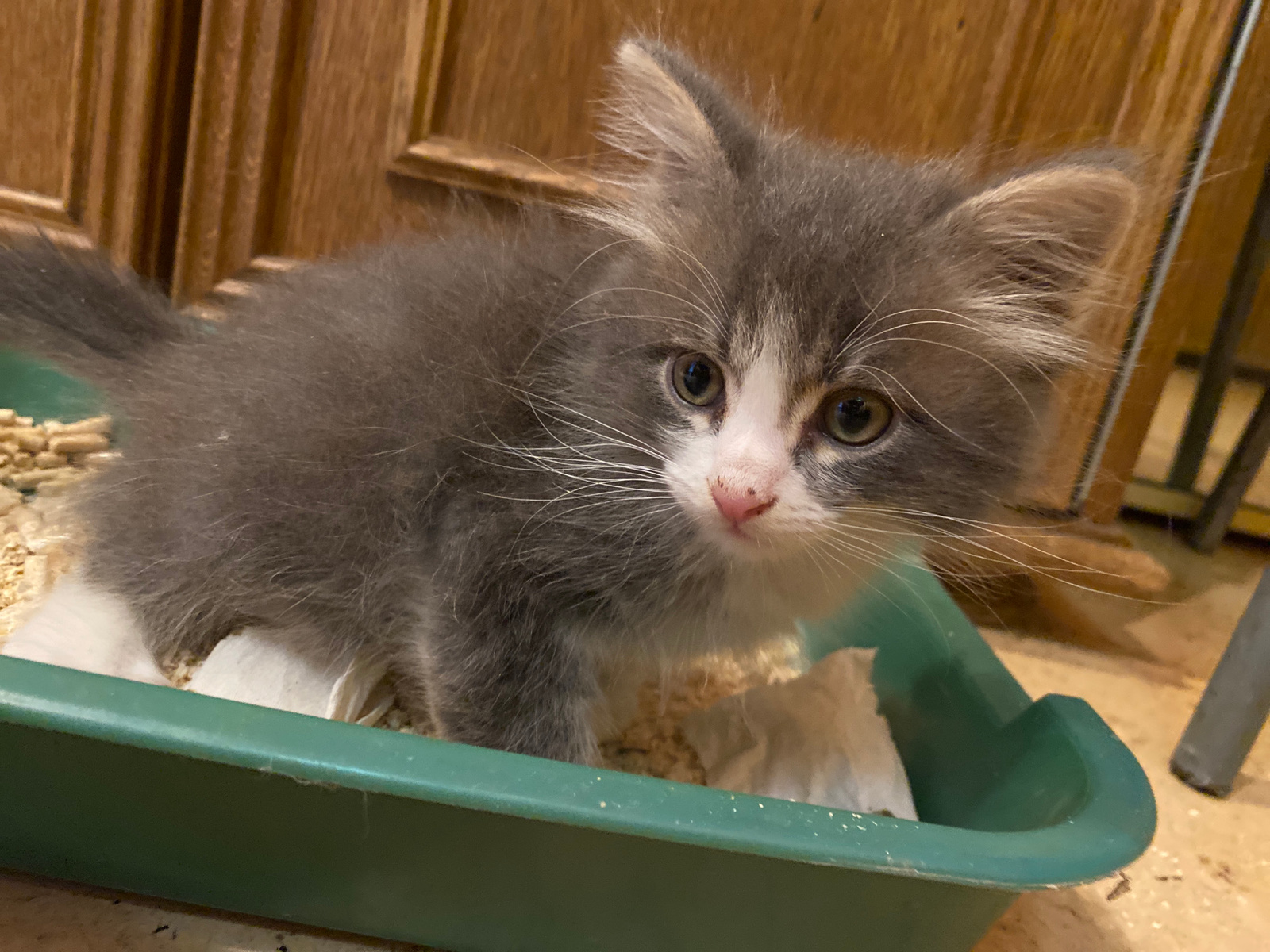 A fluffy grey and white kitten is the central subject of this close-up, indoor photograph, taken in Прикамский, Russia. The kitten's head and front paws are prominently featured, peeking over the edge…read more
