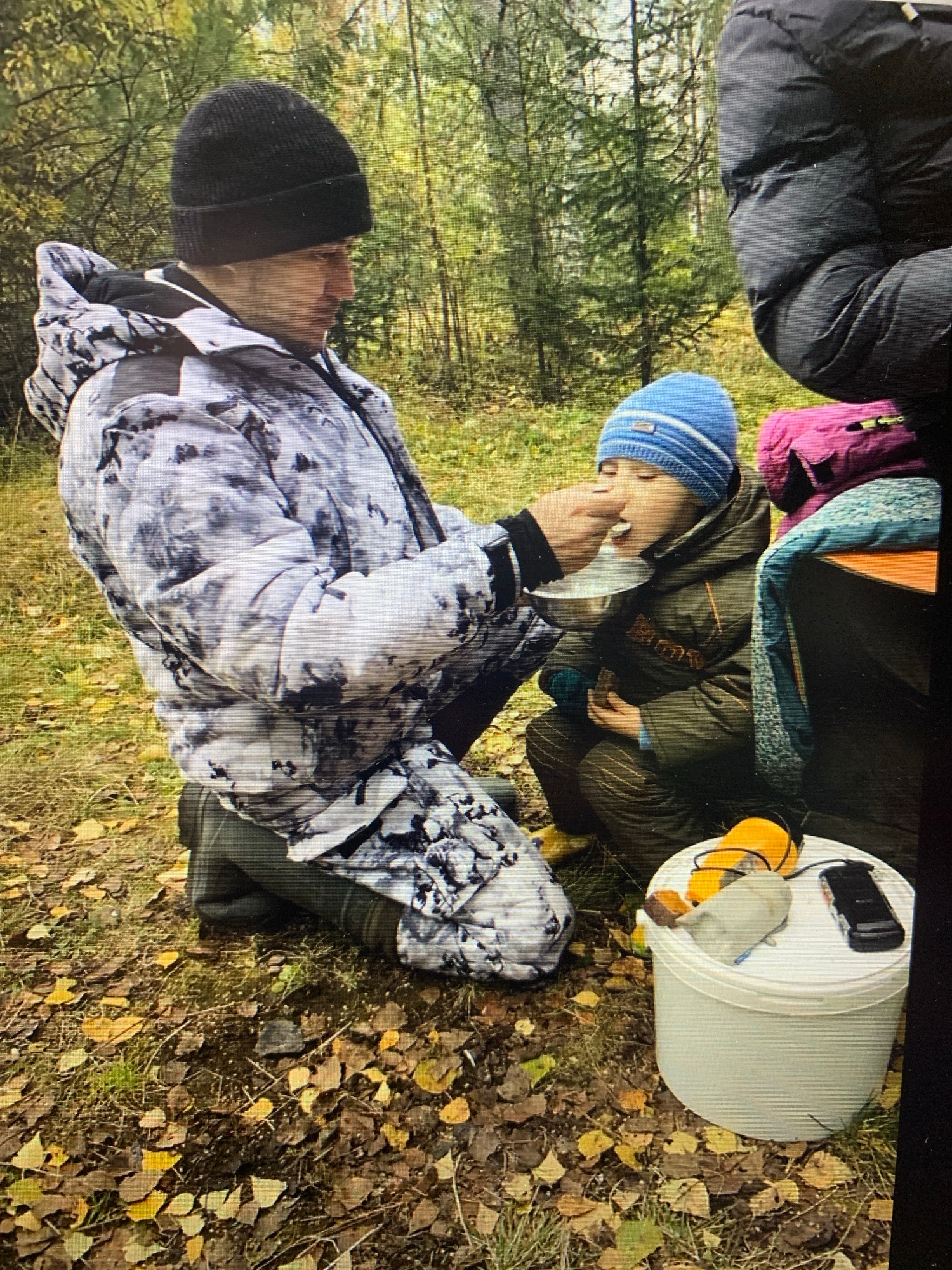 The image shows two individuals outdoors. An adult wearing a black beanie and a jacket patterned with a white and gray camouflage design is kneeling. A child wearing a blue beanie, a brown jacket, and…read more