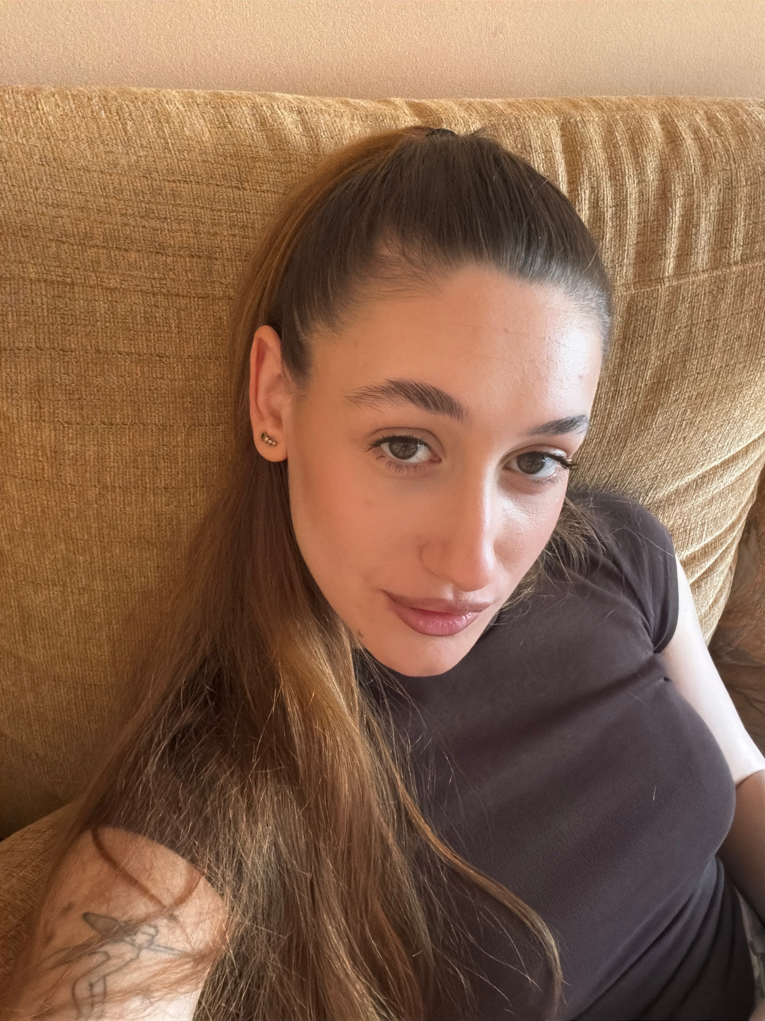 A woman is lying on a tan upholstered surface, possibly a sofa or a bed. She is facing the camera with her head tilted slightly. She has light skin, brown hair, and brown eyes. She is wearing a dark b…read more