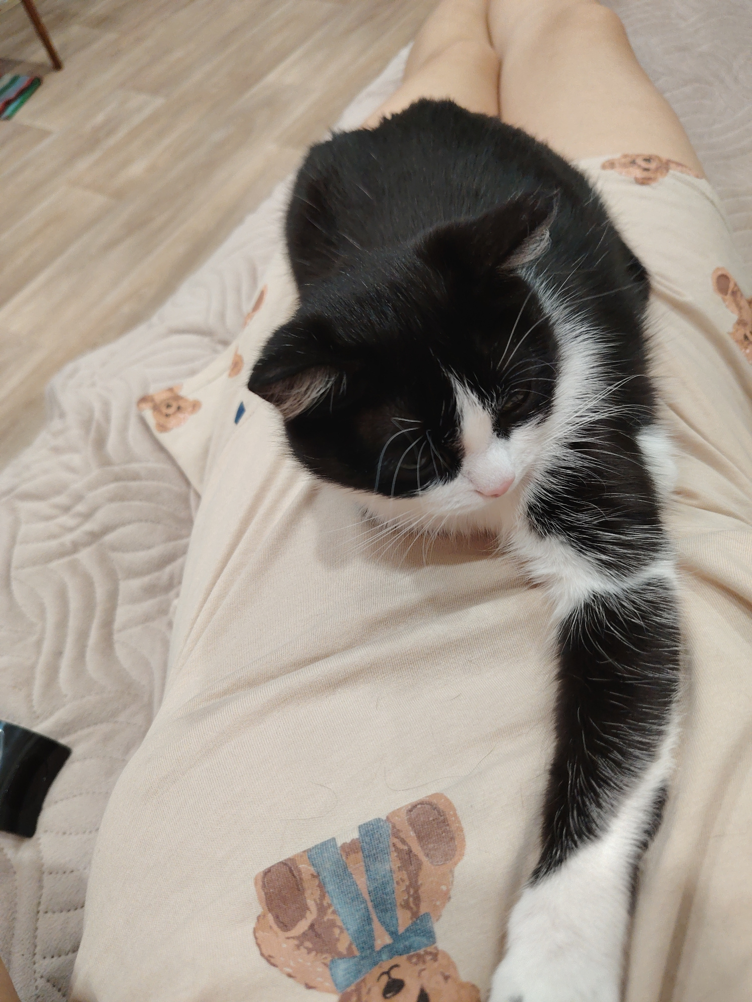 A black and white cat is lying on a person's lap. The cat is mostly black with white markings on its face, chest, and paws. It is extending its front paw downwards. The person is wearing light-colored…read more