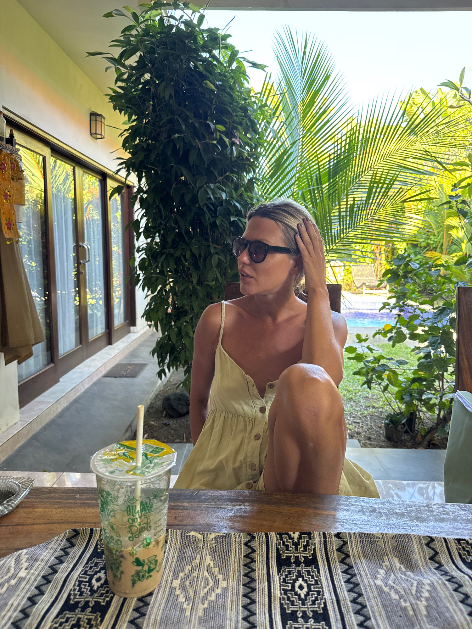 A blonde-haired woman wearing sunglasses and a light-colored dress is seated at a wooden table on a veranda. She has one hand raised to her head. The table is covered with a patterned cloth. A plastic…read more