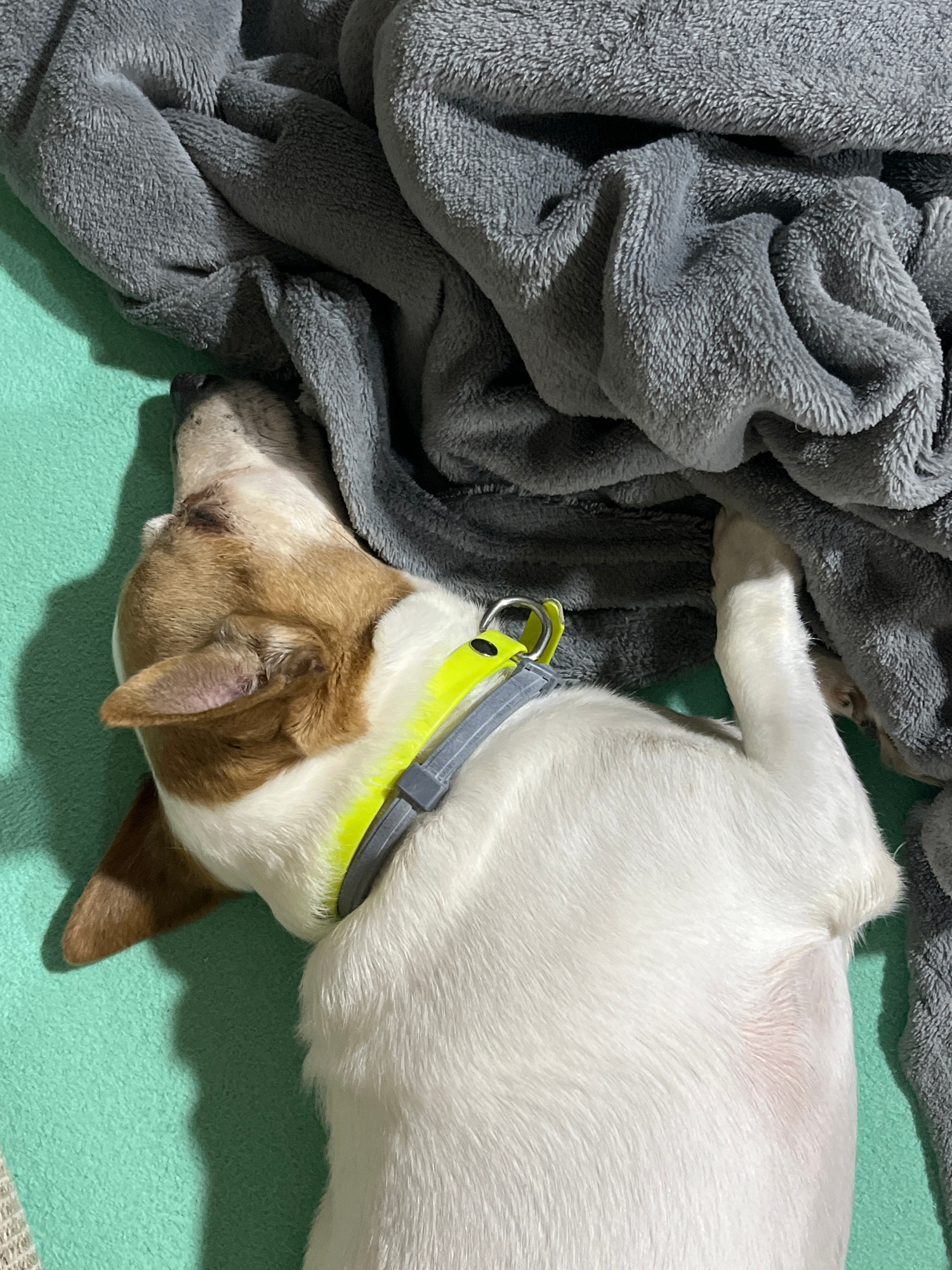 A dog is sleeping on a turquoise surface next to a gray, plush blanket. The dog is mostly white with brown markings on its head and ears. It is wearing a yellow and gray collar. The scene is indoors.…read more