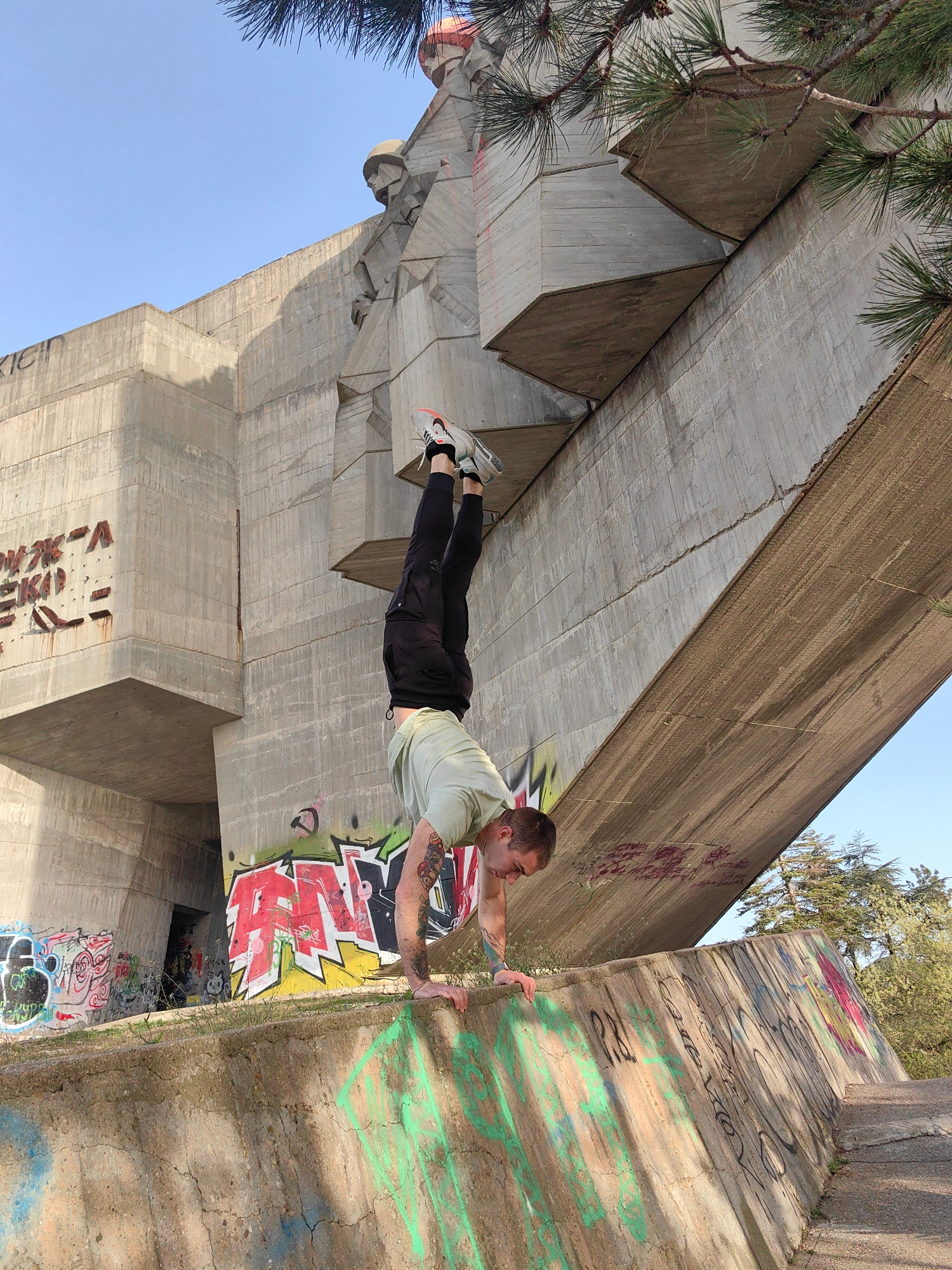 A Caucasian male performs a handstand on a concrete ledge at the Monument of the Bulgarian-Soviet Friendship in Varna, Bulgaria. He wears dark pants, a light green t-shirt, and sneakers with white sol…read more