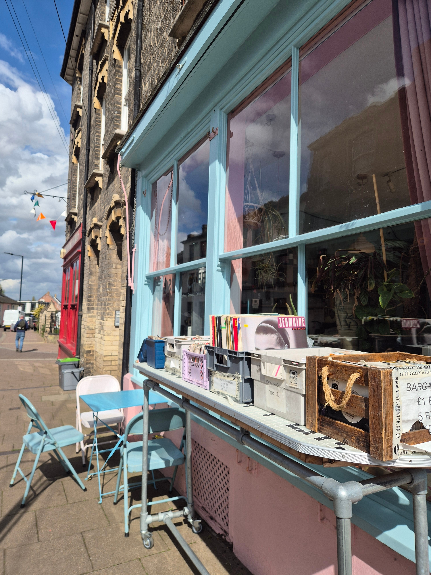Here is a detailed description of the image: **Scene:** An outdoor shot of what appears to be a storefront in a West Suffolk, United Kingdom setting. The perspective is somewhat tilted, with the building facade positioned along the left side of the frame and the sidewalk along the right. **Architecture and Storefront:** The building is a mix of brick and stucco, with sections painted in pastel colors (pink and light blue). There's a large window, reflecting the sky and clouds, under which is a display shelf supported by a metal frame. This shelf is populated with various items, including a wooden box containing what appear to be vinyl records and related promotional material. **Furniture and Sidewalk:** Several light blue folding chairs are arranged on the sidewalk, suggesting an outdoor seating area. The sidewalk is plain and grey. **Objects and Details:** The storefront window displays plants and reflections of the surrounding environment. The shelf contains a mix of records, promotional papers, and a wooden crate filled with records and ephemera. Pennants are visible in the background. **People:** A lone individual is captured in the background walking down the sidewalk. **Environment:** The scene is taken on a bright day with a partly cloudy sky. The overall atmosphere is typical of a small, quaint business district. | Open Wire
